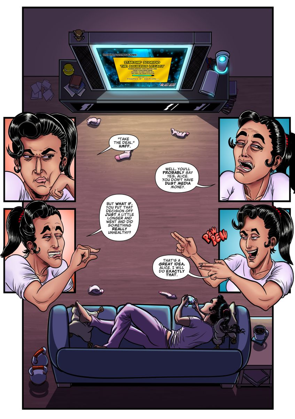 Chapter 1, Page 06. Transcript below. Panel 1: A big panel, taking up the entire page. It’s showing a TV where Alice is downloading a game, called “Starship Scorpio: The Aquarius Legacy.” Panel 2: To the left of the central panel. Alice is miffed. ALICE: “Take the deal.” Hmff. Panel 3: To the right of the central panel. Alice is resigned. ALICE: Well, you’ll probably say yes, Alice. You don’t have Dust Media money. Panel 4: To the left of the central panel. Alice is looking across at Panel 5, holding her thumb and forefinger half an inch apart. ALICE: But what if, you put that decision off just a little longer and went and did something really unhealthy?” Panel 5: Alice looking across at Panel 4, shooting herself finger guns. ALICE: That’s a great idea, Alice. I will do exactly that. At the bottom of panel 1, at the end of the reader’s sightline, is Alice lying on the couch with a video game controller in hand.