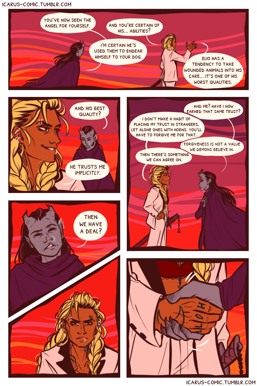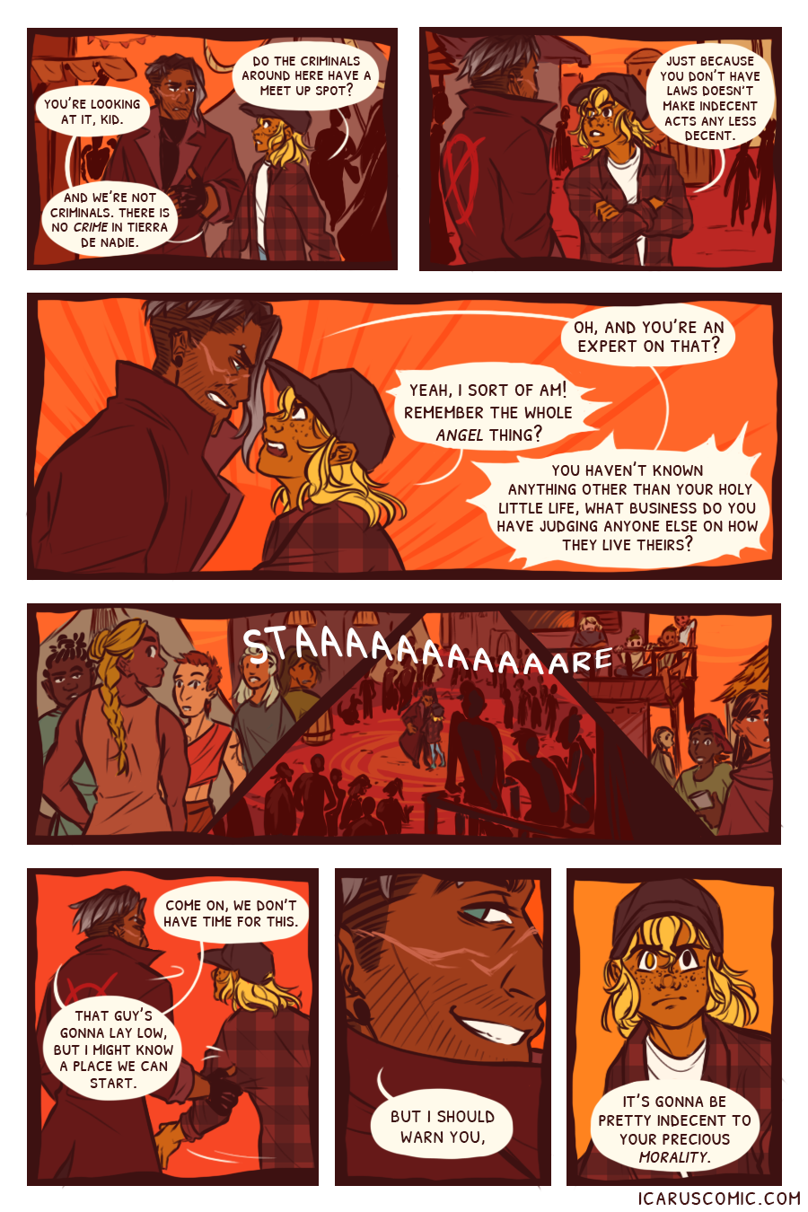 This webcomic is an exploration of light, darkness, and the relativity of moral ambiguity. Follow the unlikely pair of Icarus and Elio as they discover one another's weaknesses and strengths through an action-packed journey through the wasteland.