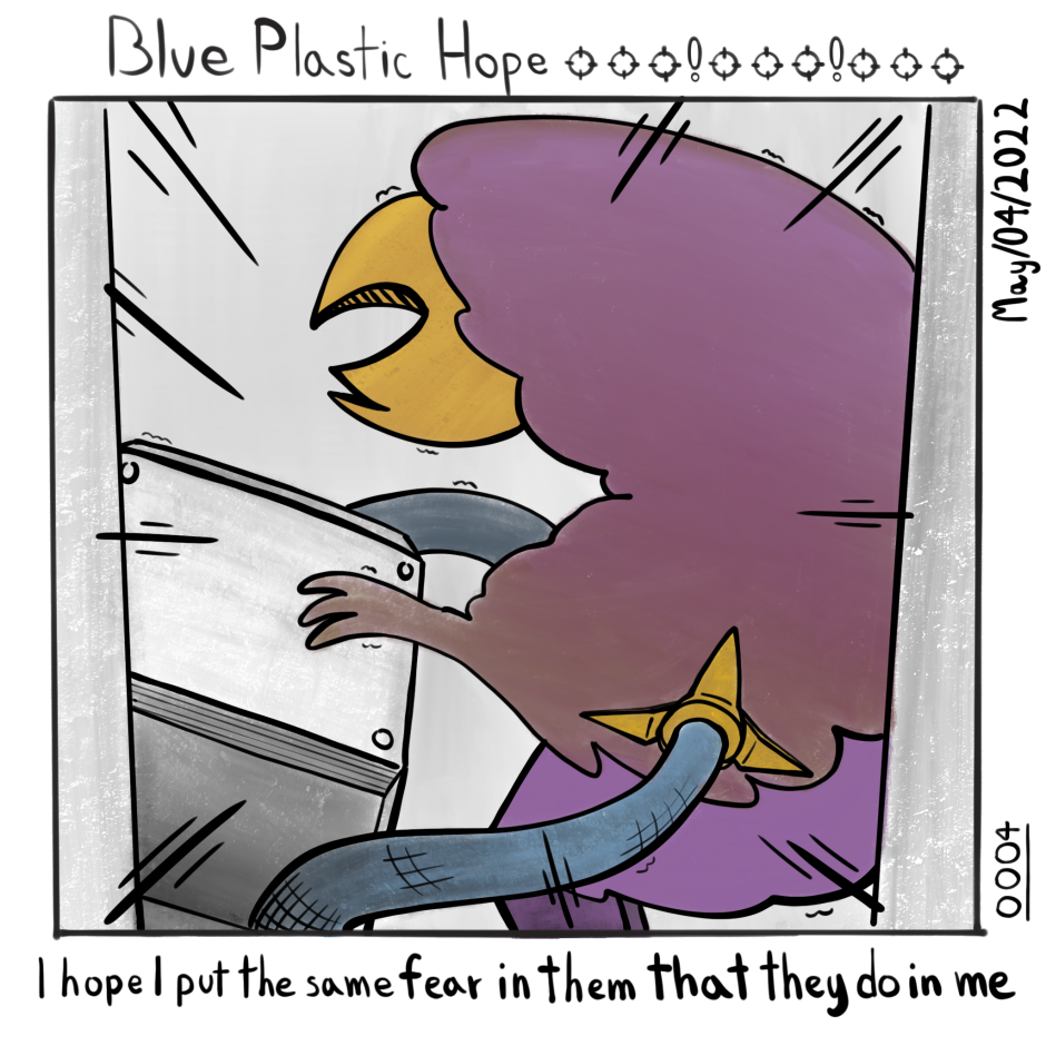 Blue Plastic Hope is an experiment in single-panel comics. Forgoing the usual gag-a-day style, and instead attempting to showcase a serious day in the life of a mech pilot.