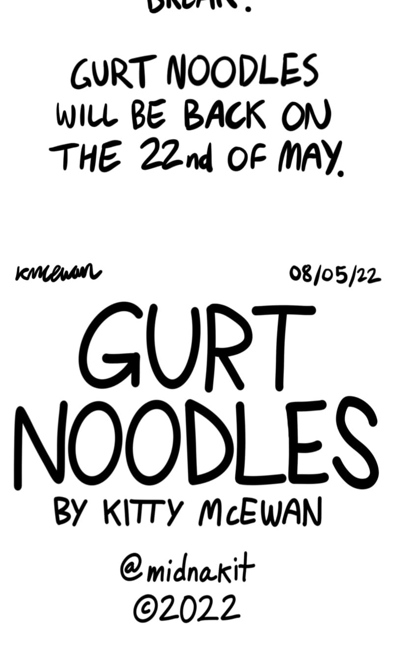 Due to work deadlines I am taking a short break from writing Gurt Noodles. I will be back posting comic strips on the 22nd of May. If you like my work, check out my Instagram @midnakit!