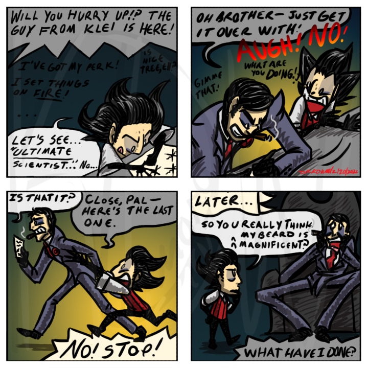 Wilson didn't have any ideas for his perk so Maxwell stepped in. This one I think you can really see the influence Calvin and Hobbes and Foxtrot had on me in my formative years--the last-panel gag is definitely something that Foxtrot is good for.