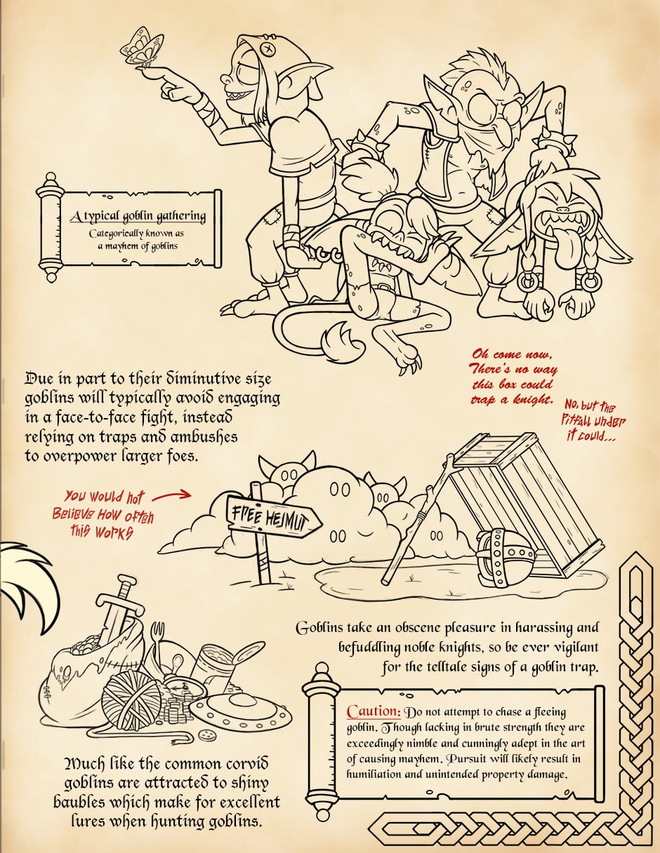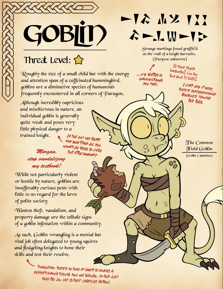 No comic this week! Have a little side project I was working on instead. I thought it would be neat to write up entries for the various critters inhabiting Paragon, just to give a little more flavor to the world. I figured making it like a page from a textbook the girls would be studying, complete with color commentary from the cast scribbled in the margins, would be extra fun.