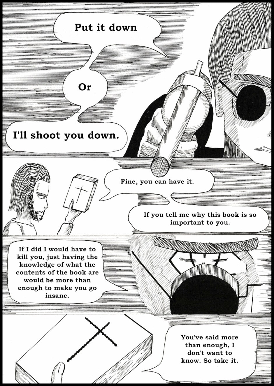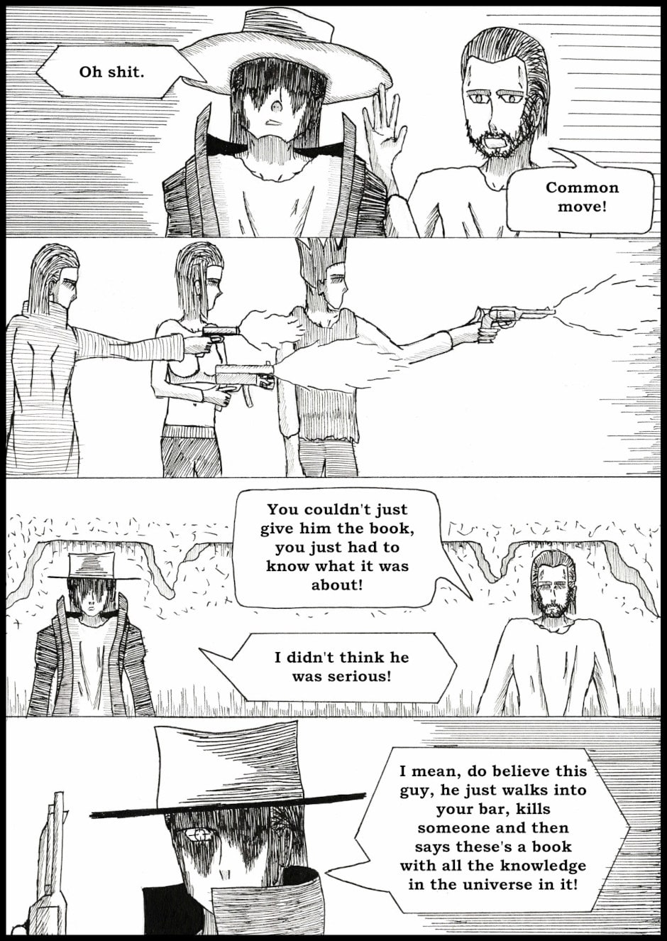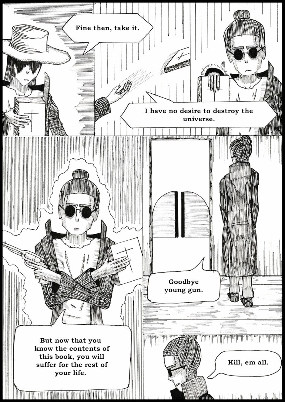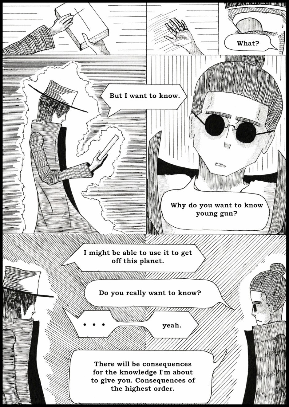 A stranded gunslinger is on a journey to get off-world, but encounters a strange book of heresy that contains all things that should not be known for the sake of the universe.