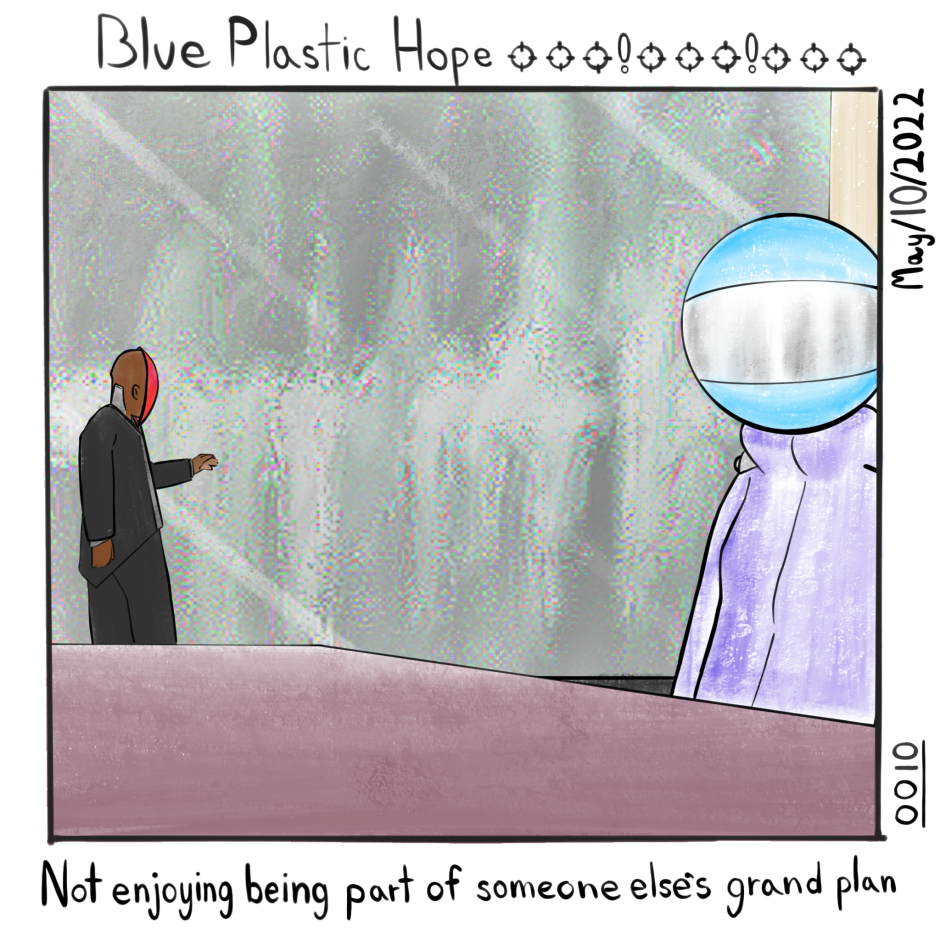 Blue Plastic Hope is an experiment in single-panel comics. Forgoing the usual gag-a-day style, and instead attempting to showcase a serious day in the life of a mech pilot.