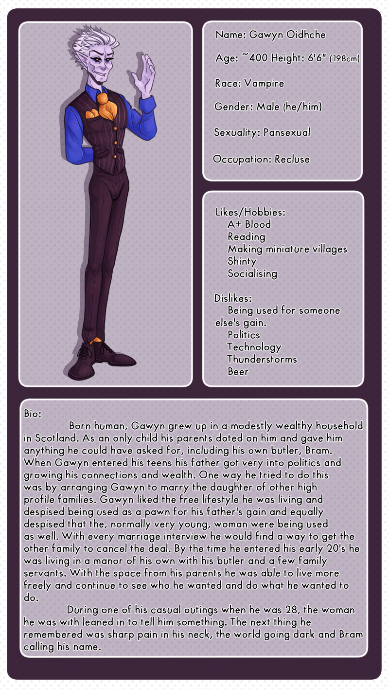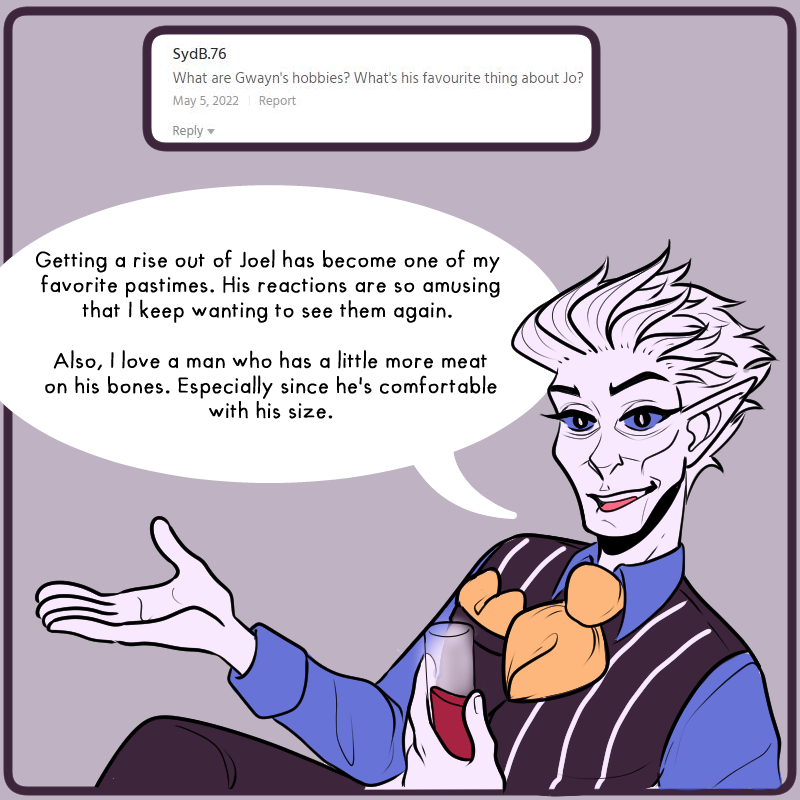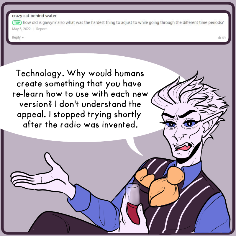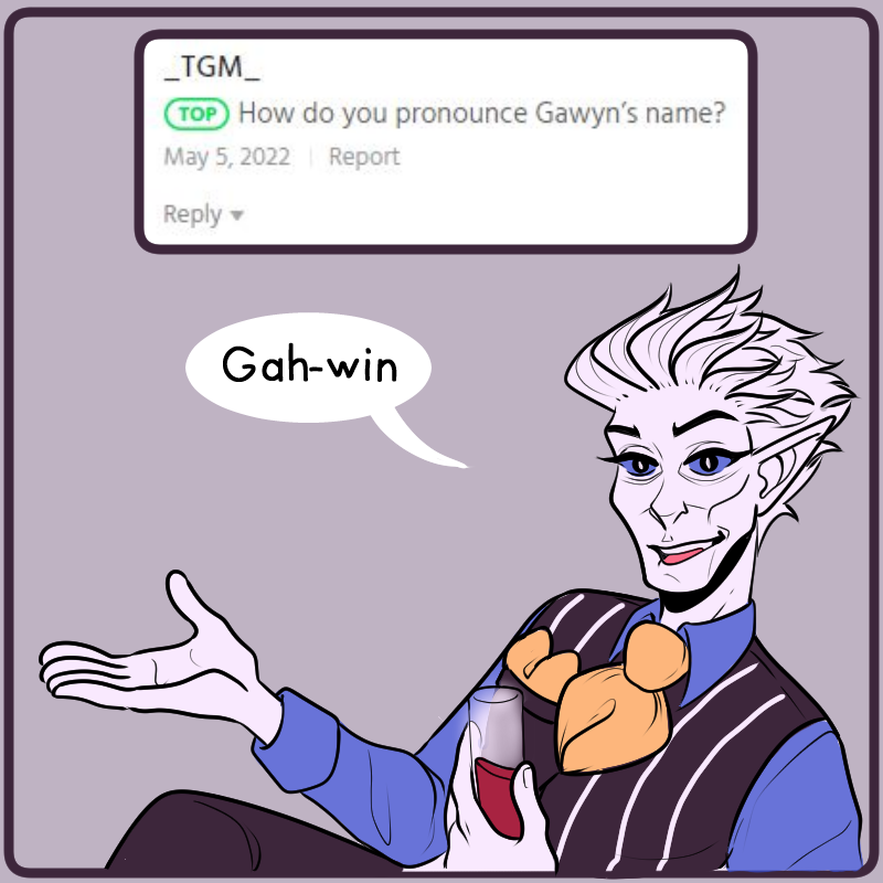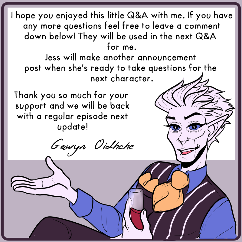 I originally planned on posting this after the next episode, but the next episode turned out to be 3 times longer than anticipated. So, I hope you're okay with hearing from Gawyn this update instead! I didn't want to leave you hanging today. I will be deleting the original announcement post for Gawyn, so ask any more questions about/for him here!
