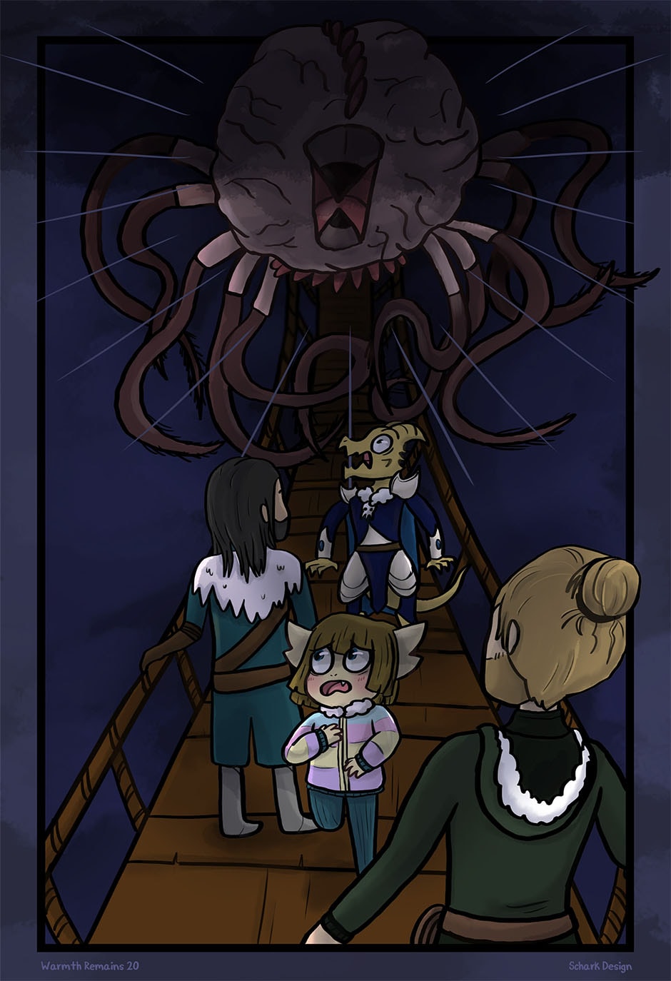 A small group unlikely heroes transverse the unforgiving landscape of an ice covered wasteland. Along the way they'll uncover: Who's committing such vicious murders? What's causing it to be such a frozen, desolate place? Will the sun ever return? The answers must be under all that snow. CW: Mild blood and fantasy violence.