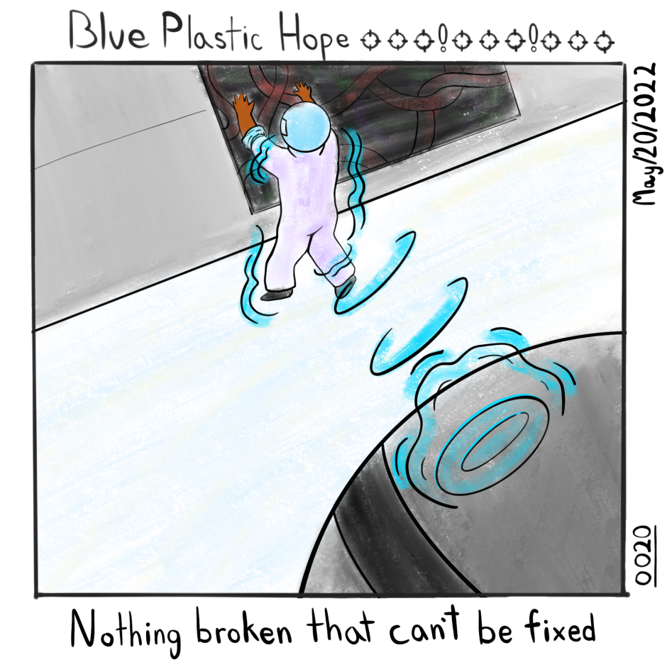 Blue Plastic Hope is an experiment in single-panel comics. Forgoing the usual gag-a-day style, and instead attempting to showcase a serious day in the life of a mech pilot.