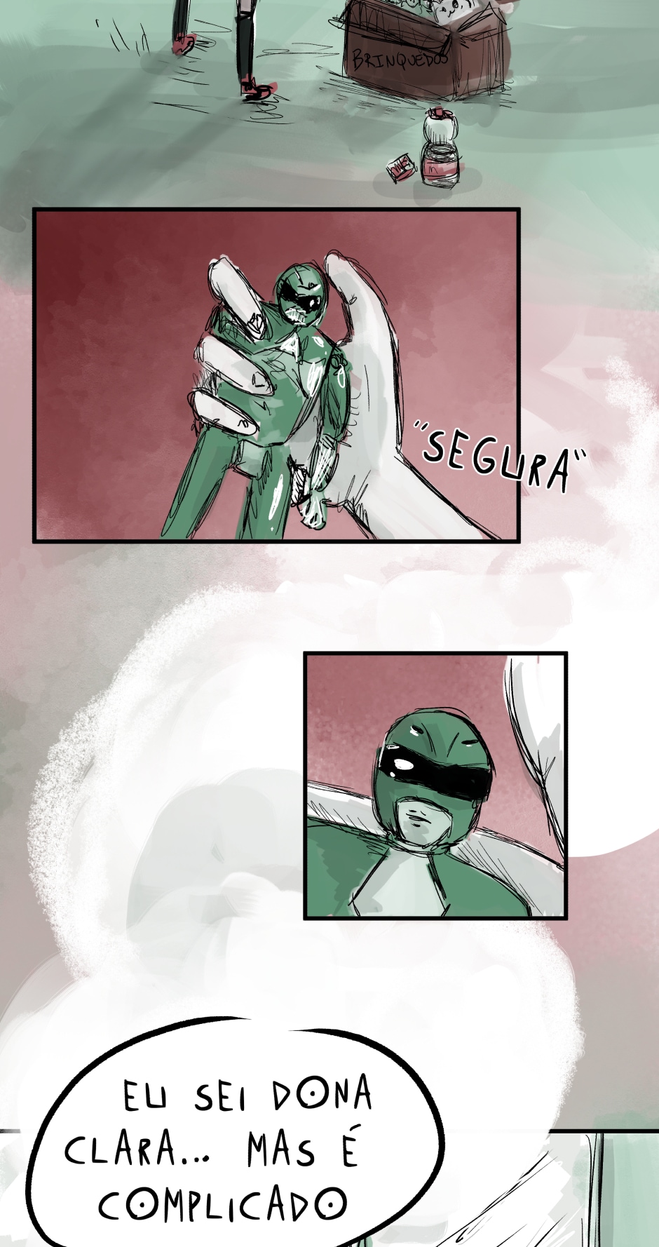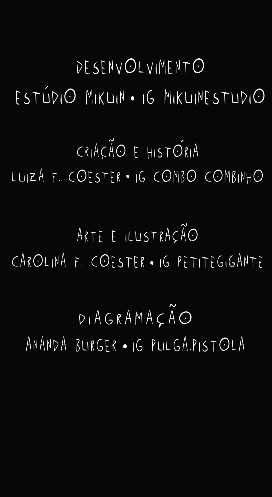 Equipe: Luíza F Coester | IG @combo_combinho - Criação e história - Roteirista chefe Carolina F Coester | IG @Petitegigante - Arte e ilustração - Colorista - Assistente de criação - Assistente de roteiro Ananda Burger | IG @pulga.pistola - Design de página - Diagramação