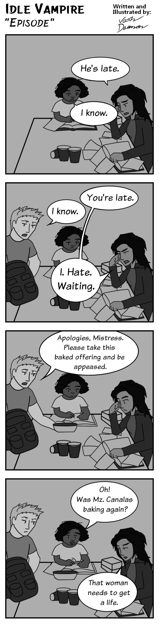 Attending his second year in college, Justin's primary concerns were passing his classes, and figuring out exactly what sort of career he wanted in the future; so it's not surprising that he realized far too late that his slacker roommate turned out to actually be an ancient blood-drinking monster (not that this discovery has done much to change their relationship).
