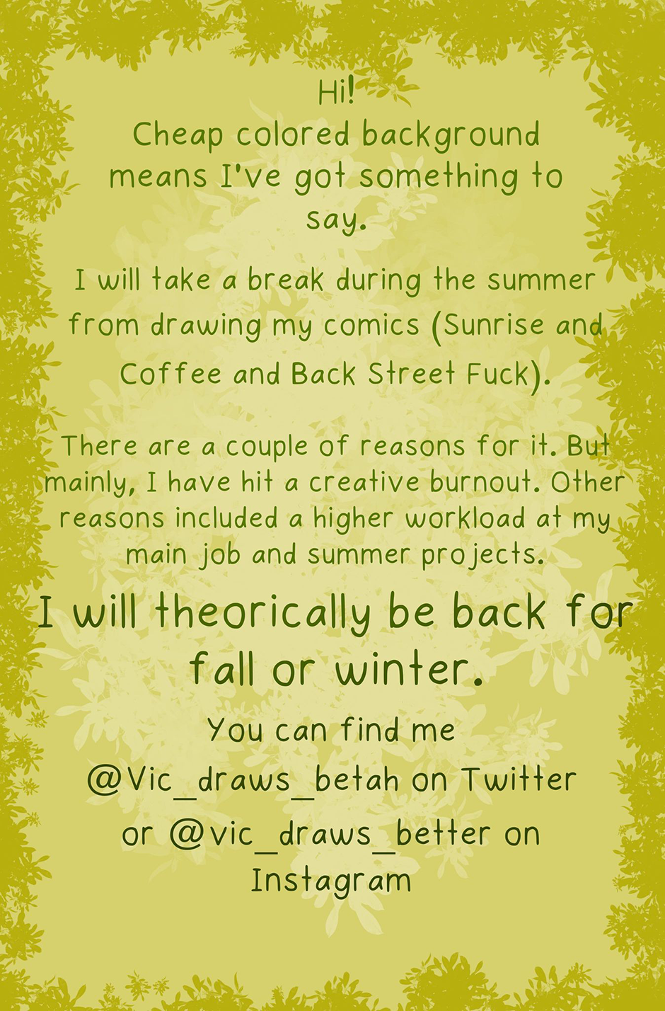 "Cheap colored background means..." Your messages are always funny. Don't worry, work calls, we'll be here ;-) Relax and enjoy your summer!