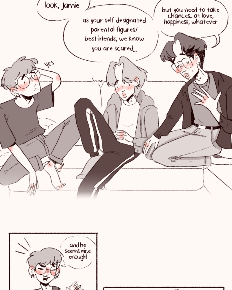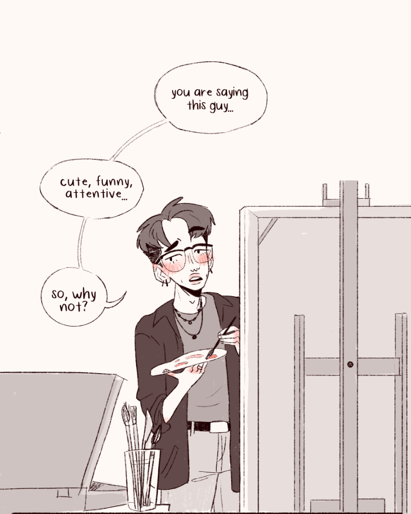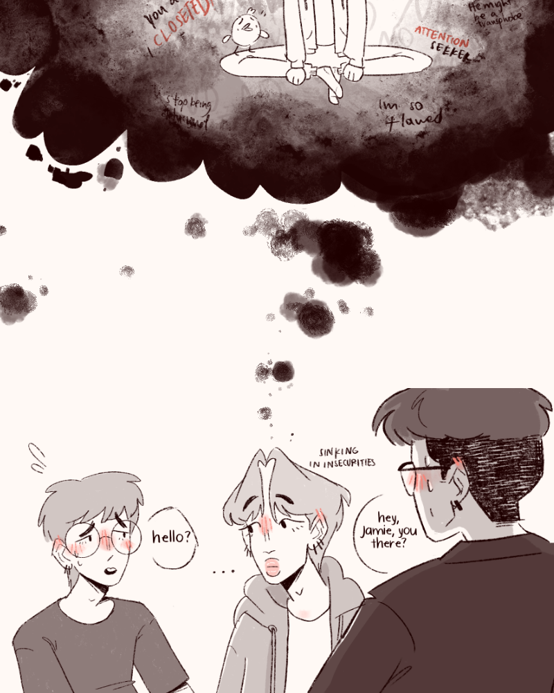 Jamie is a very tired, very gay artist whose life changes with a knock on his door after an especially awful day in the office. Enter Jay, a fiery barista with a heart of gold. Their paths intertwine when a pair of mysterious guides appear, uniting them in an unexpected turn of events that almost feels like destiny. Join Jay and Jamie to explore a tale of queerness, mental health, and… love!