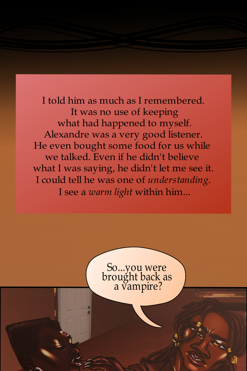 Rose tells Reverend Alexandre what she recalled happening to her. All down from meeting Lucius to the prior night's events. He listened to her story intently, Rose appreciated it. However, the reverend makes a speculation that she became a 'vampire' when resurrected. She doesn't realize what he has seen until she looks in the mirror.