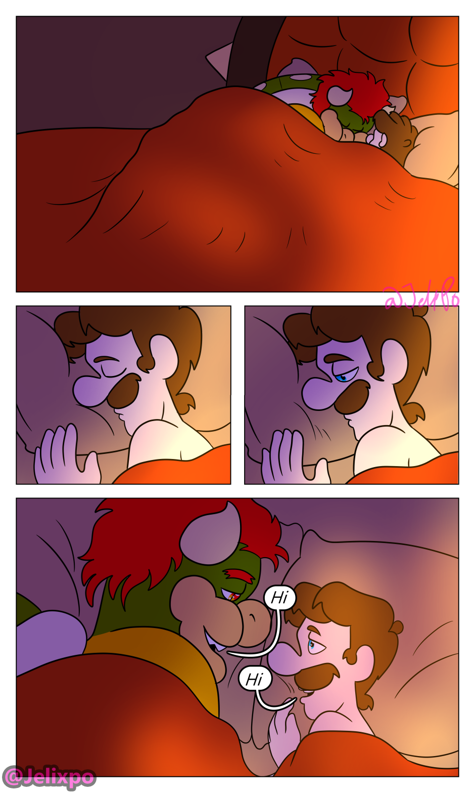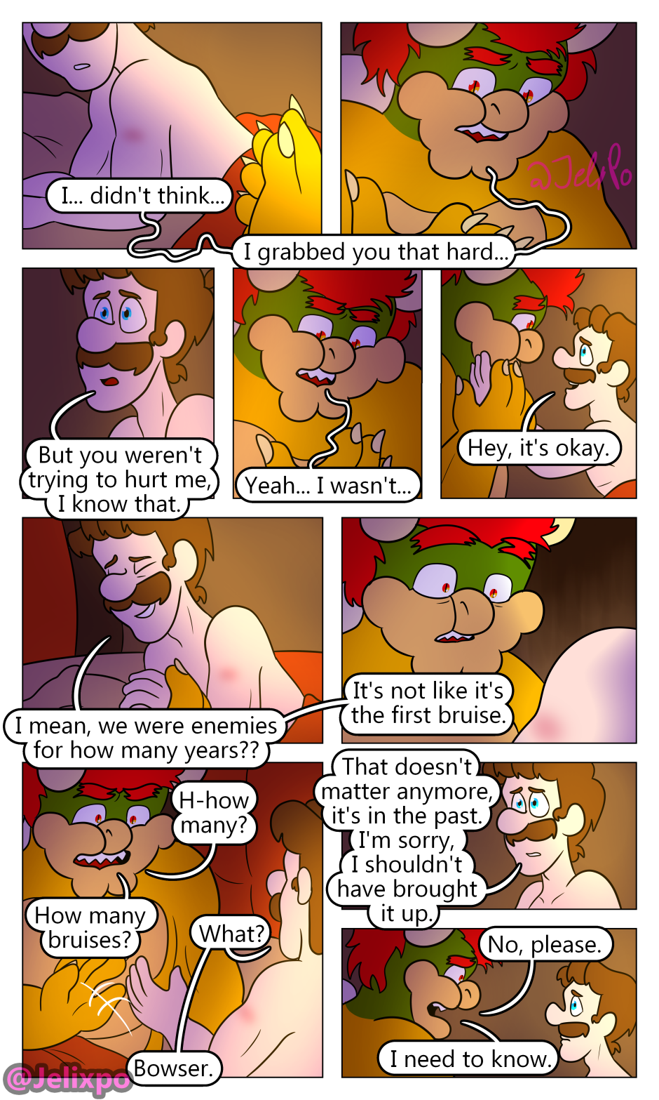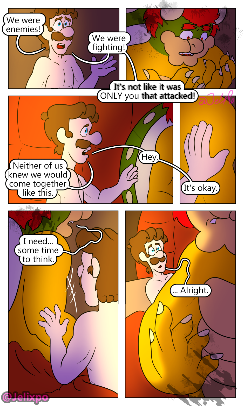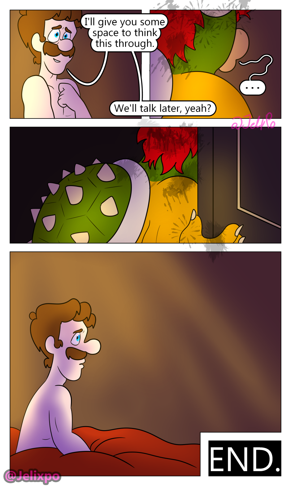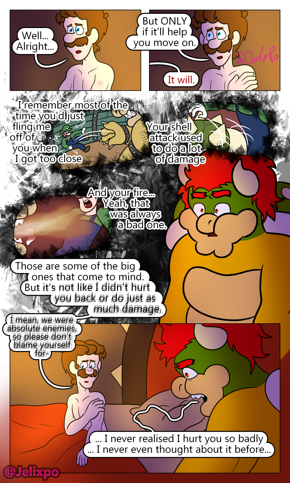 if you’re thinking “hey Bowser’s spikes look weird in this chapter” it’s because, as PROVEN in Mario Galaxy 1, Bowser’s spikes are retractable (look it up if you don't believe me) so I had them retracted in all the shots he was laying in bed.
