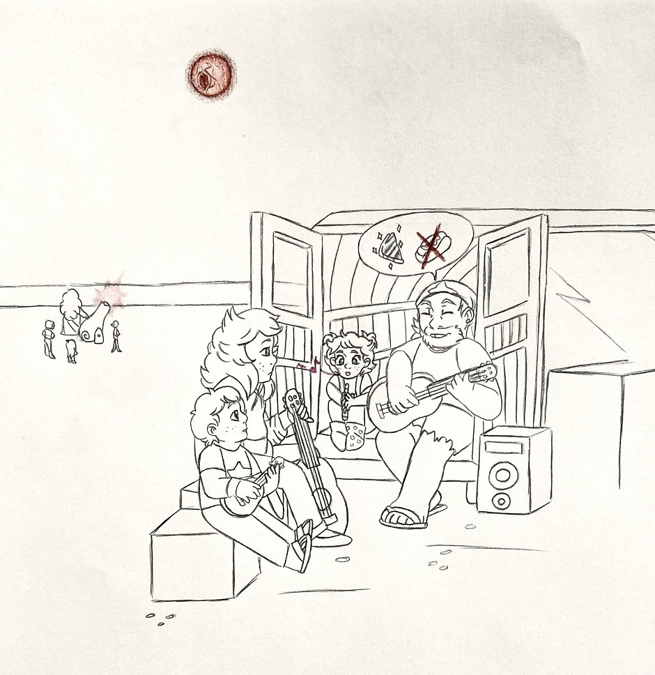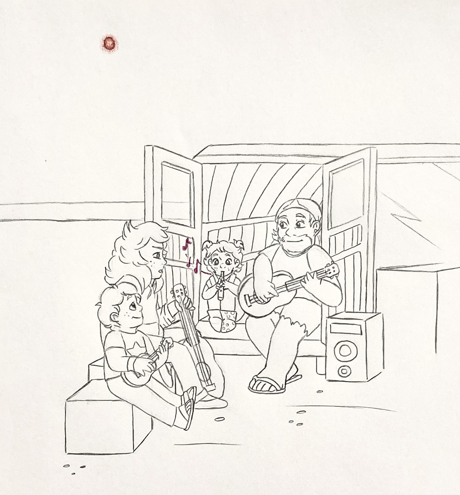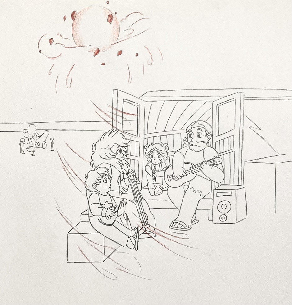 The three Universe siblings are hanging out with their dad, Greg. Steven and Chloe are messing around with music, while Nora is tinkering with the van’s engine. Greg calls Nora over to join their “band”.