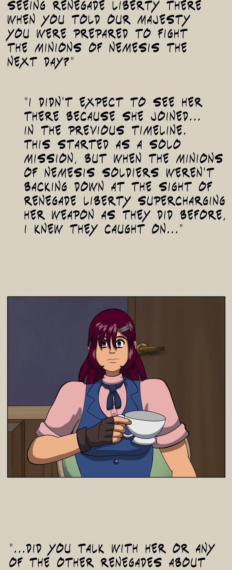 She went back to 1884 to meet Susana, a human who would become a great historical figure in the events that were to follow. Susana joined the Magical Renegades as Renegade Liberty, and stopped a takeover, but the magic that they promoted fell into the hands of Renegade Midnight Conductor's rival, another rogue time traveler who used power to begin taking over space-time! With one of the four superweapons under her control, this rival would be formidable to any opposition!
