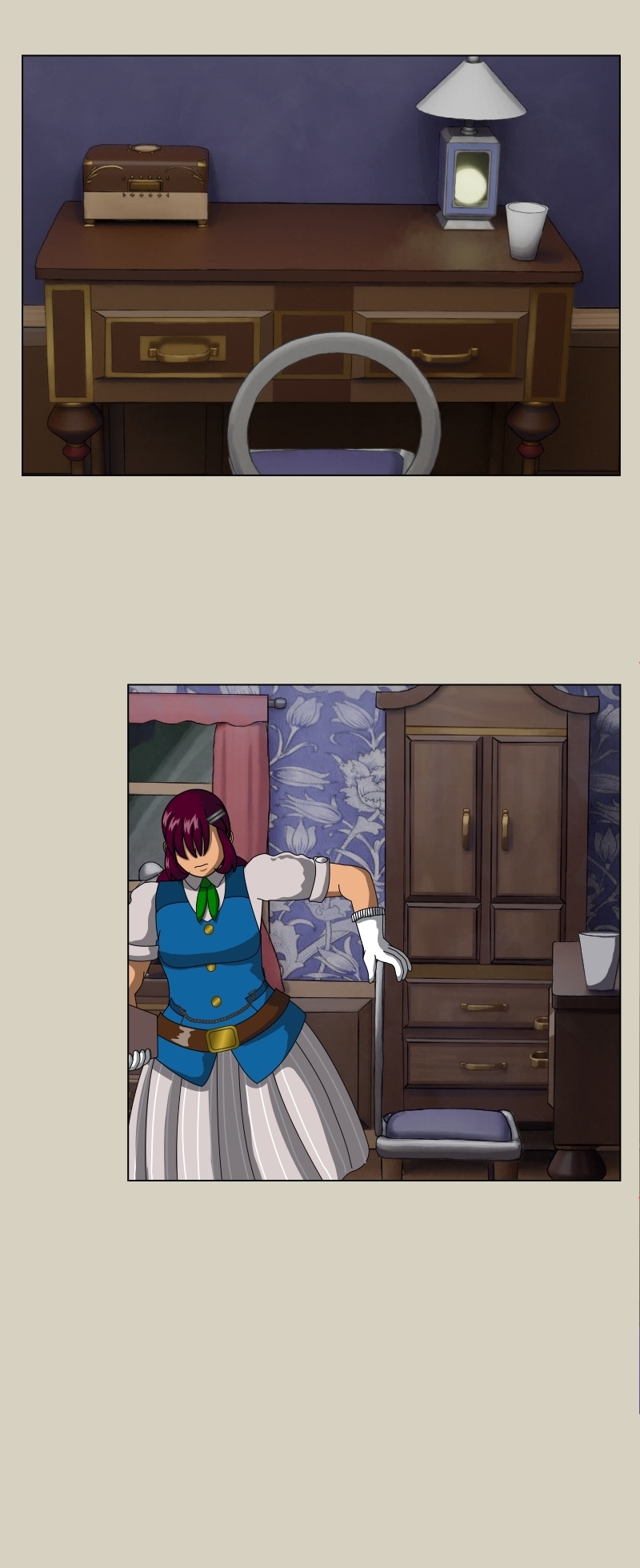It's been 2 months since the last episode was published. Production of this episode began immediately after the last episode was launched, and it was juggled with chapters 10-12 of Extra! Chronicles! This was another that extensively made use of Blender for interior backgrounds. It was fun designing the furniture and architecture for the room that appears here, but that took up a lot of the production time! 😅