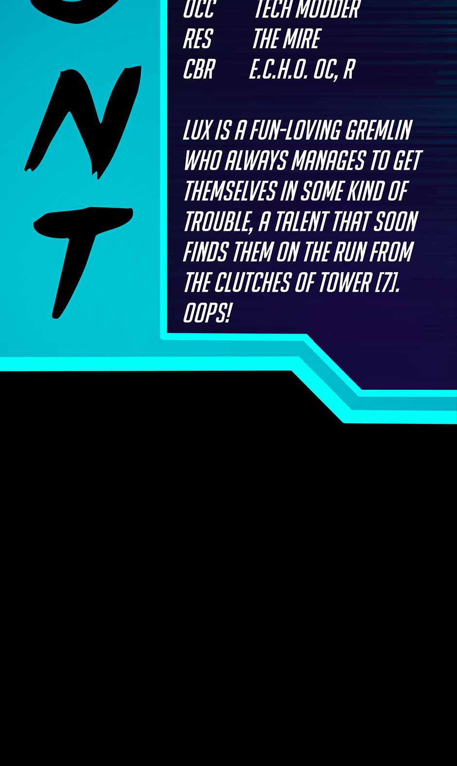 MEET LUX! They're a total gremlin child who loves spending their free time dumpster diving for discarded tech and revamping said tech into somethin' new.