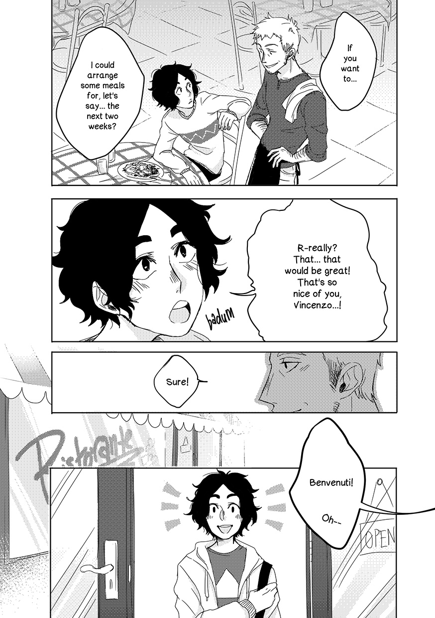 Savino moved into a new town, got a new job and is feeling rather anxious about it. His appetite has been gone for a while until he coincidentally stumbles into a small restaurant. It is owned by Vincenzo, a happy-go-lucky father and his teenage daughter Gianna.