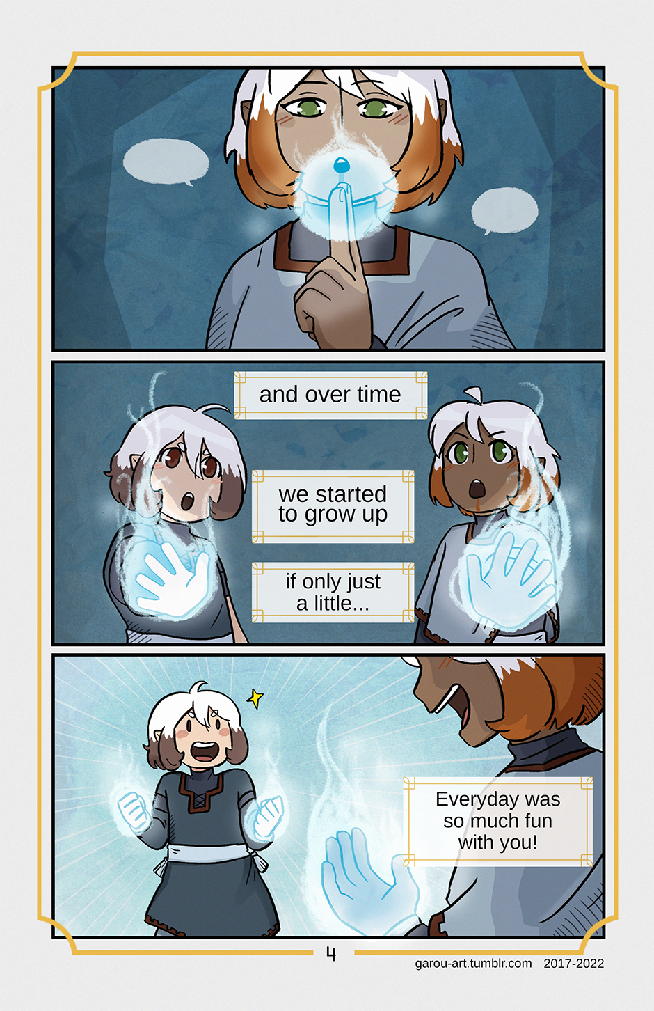 Both fae children are older now, their hair progressively turning more white from the roots down. There are silent whispers as one of them recites magic. Both of their hands light up in a blue aura and they're thrilled it worked. Text reads "And over time we started to grow up, if only just a little... Everyday was so much fun with you!"