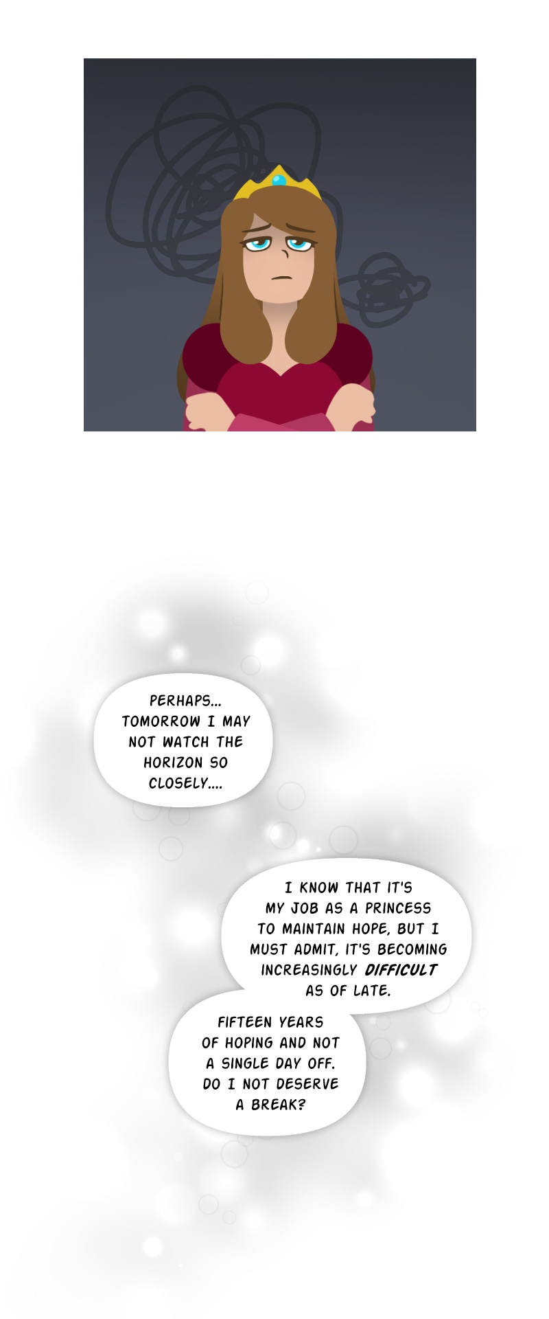 While waiting for her knight in shining armor to rescue her from a fire breathing dragon, Princess Lucy makes a poorly worded wish on a shooting star, and it takes her on a magical adventure to outer space! With help from the mysterious starstone, a fugitive alien prince, and many strange new friends, Lucy must navigate a whole galaxy to get back home, bringing a little bit of magic wherever she goes. [Updates weekly on Sundays!]