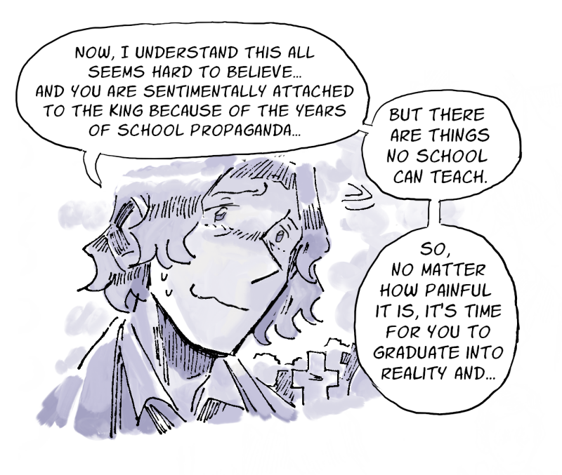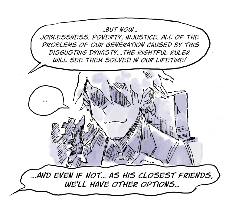 No one believes him until skilled manipulator Esker persuades brute Hagen and straight-laced class president Wicke to join his hopeless conspiracy against the King.