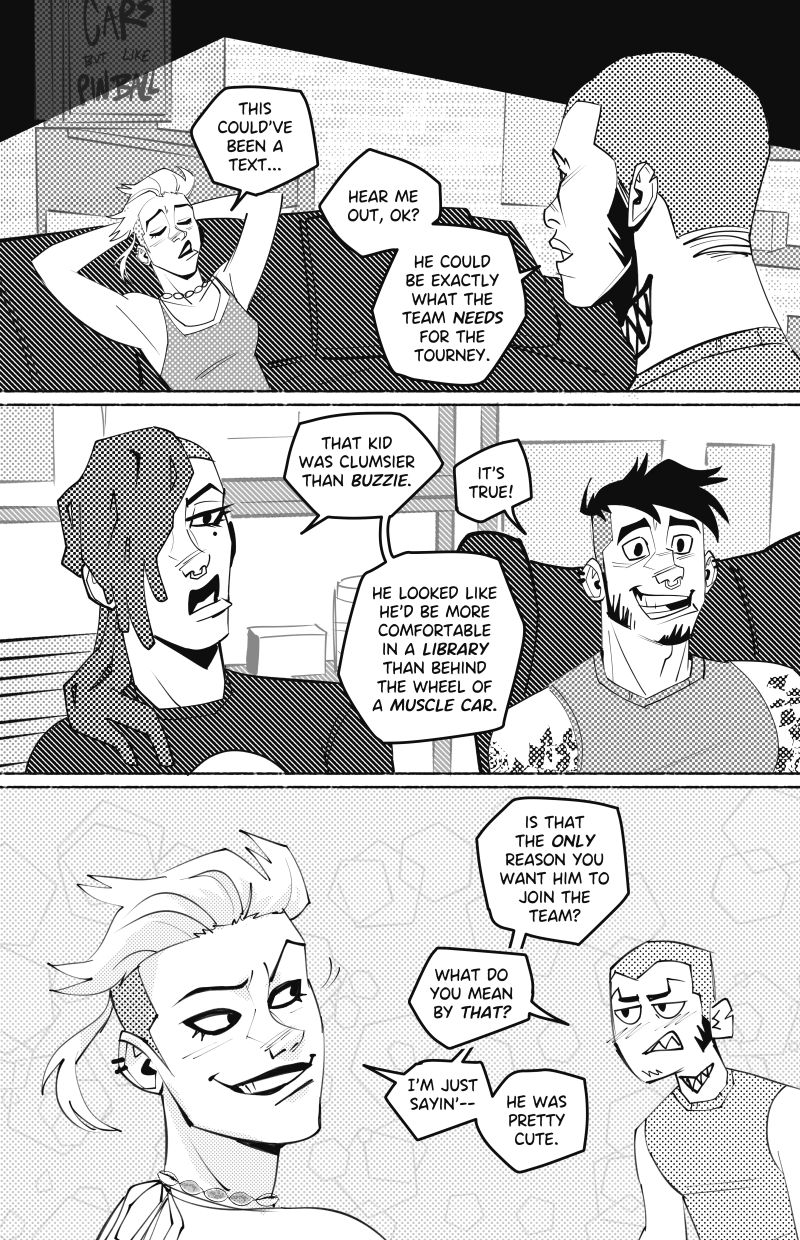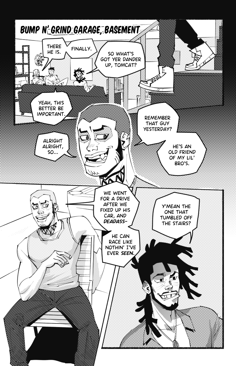 Ride or Die is an LGBTQ webcomic about two street racers who team up with a demon-possessed muscle car in the search for a missing woman, while being hunted by a deadly religious cult.