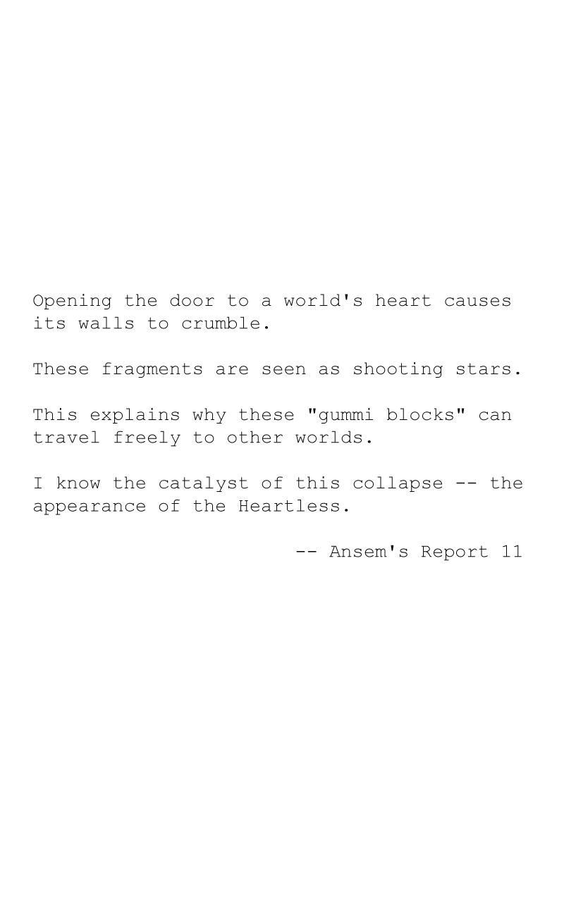Sora, Donald, and Goofy protect the Worlds of Light from the Heartless, under the watchful eye of King Mickey. But what happens to worlds where King Mickey isn't watching? What happens to the residents of worlds that King Mickey chooses not to save? Dr. David Q. Dawson has chronicled his adventures with those heroes here.