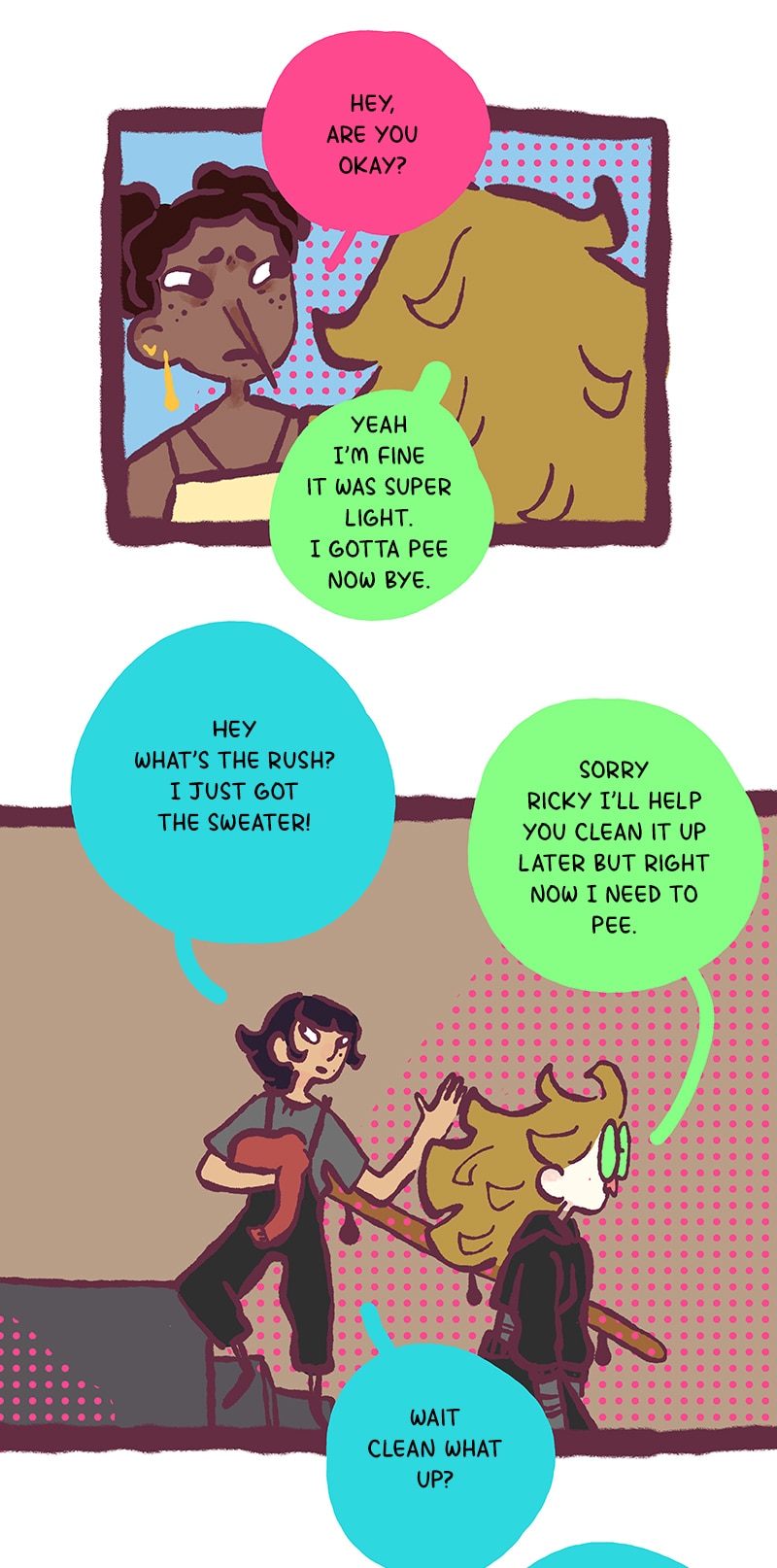 Hmmm “right now I gotta pee bye” very suspicious.. please don’t have like two broken arms