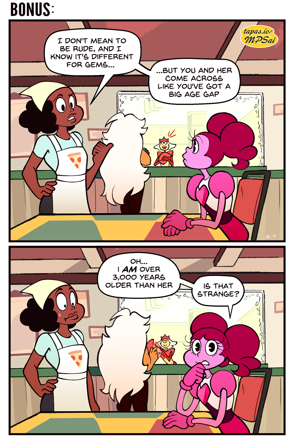 Which then lead to a follow-up with a bit of meta humor about a criticism I sometimes hear about the ship from people who forget Spinel is canonically much older than Jasper.