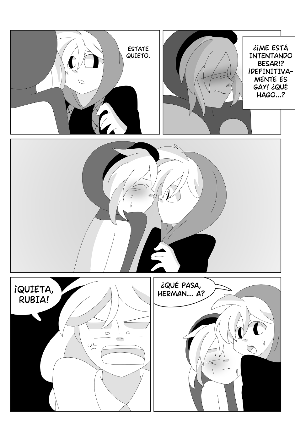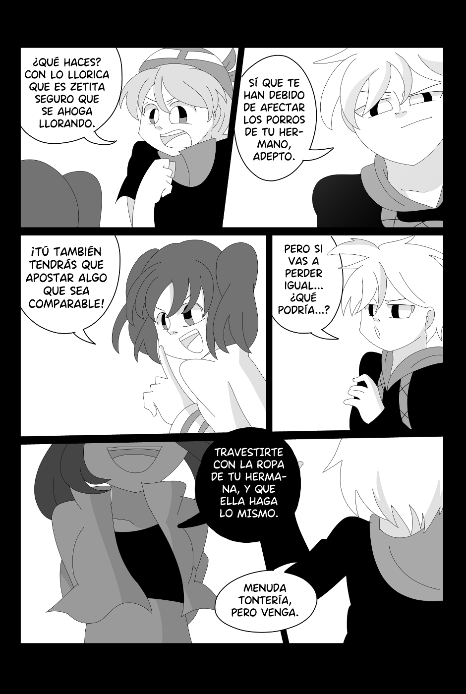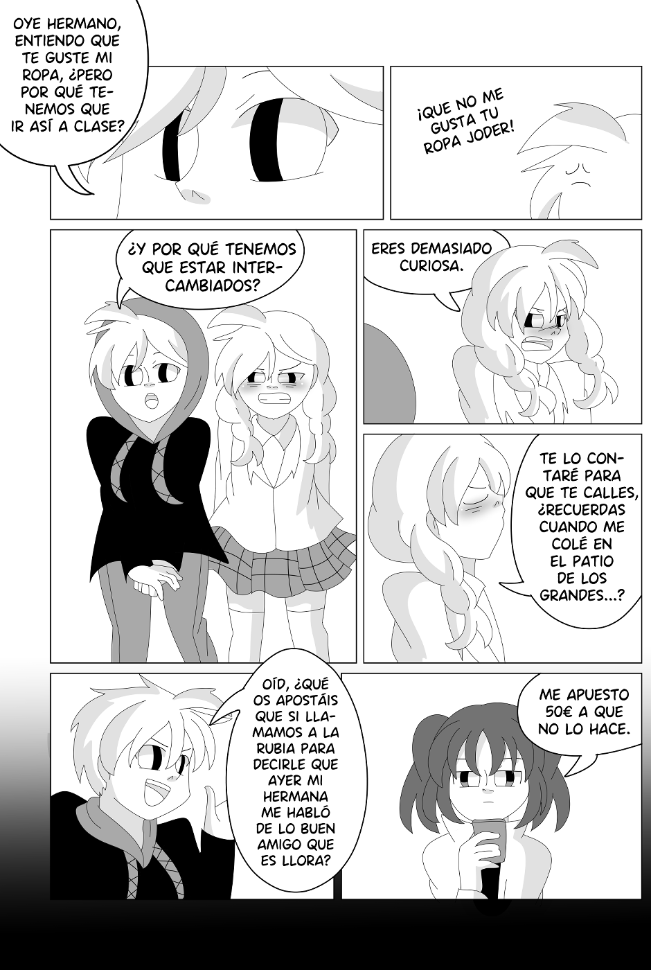 Cuando estaba creando a los personajes pensé: entre tanto hermano que estoy dibujando debería tener dos que sean gemelos, y mejor aún, que se intercambien las identidades para generar situaciones graciosas. Pero ahora mismo pienso... ¿Qué deben de pensar la gente que tiene un mellizo y lee el cómic? Porque obviamente es una situación muy surrealista la de la historia, pero tengo esa curiosidad ahora (??