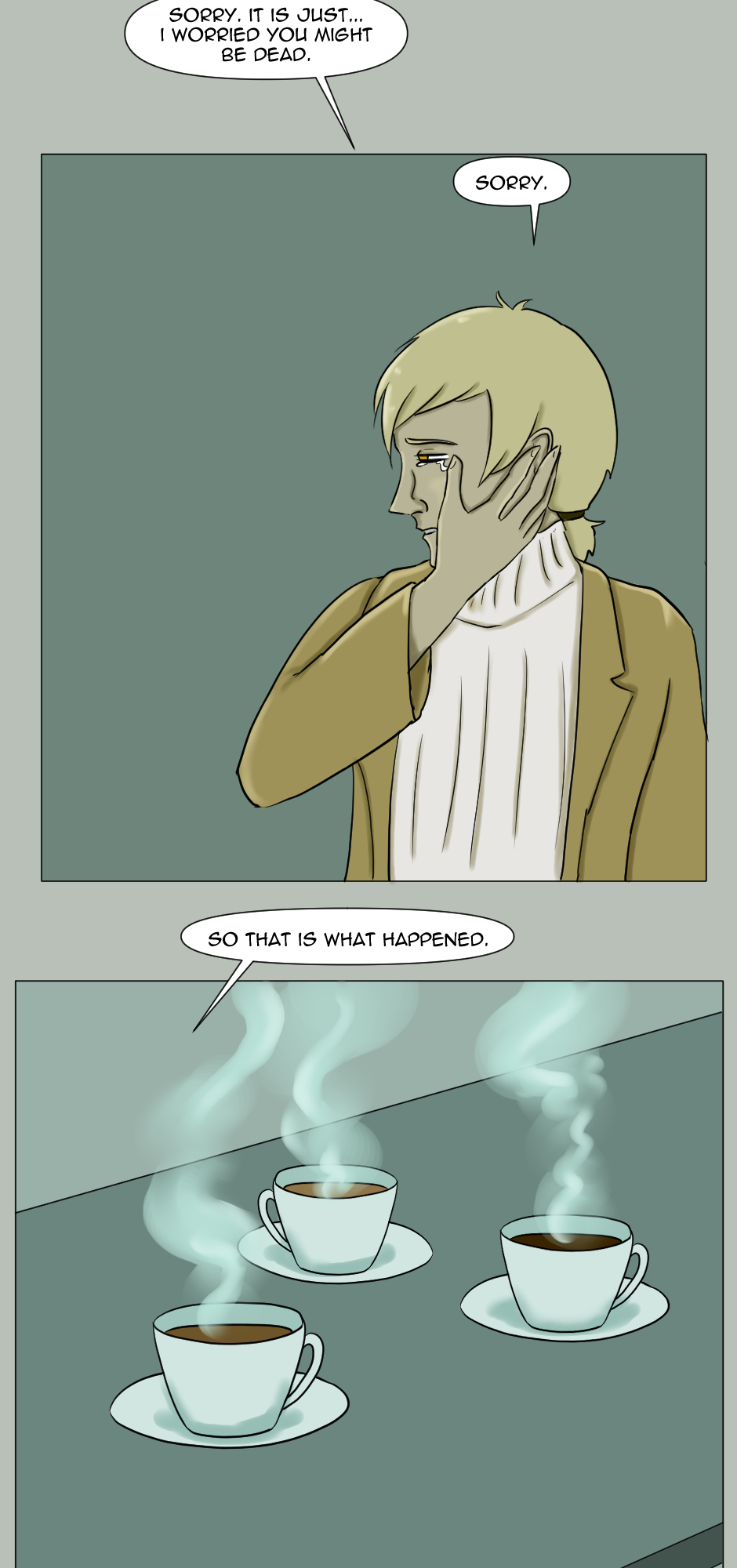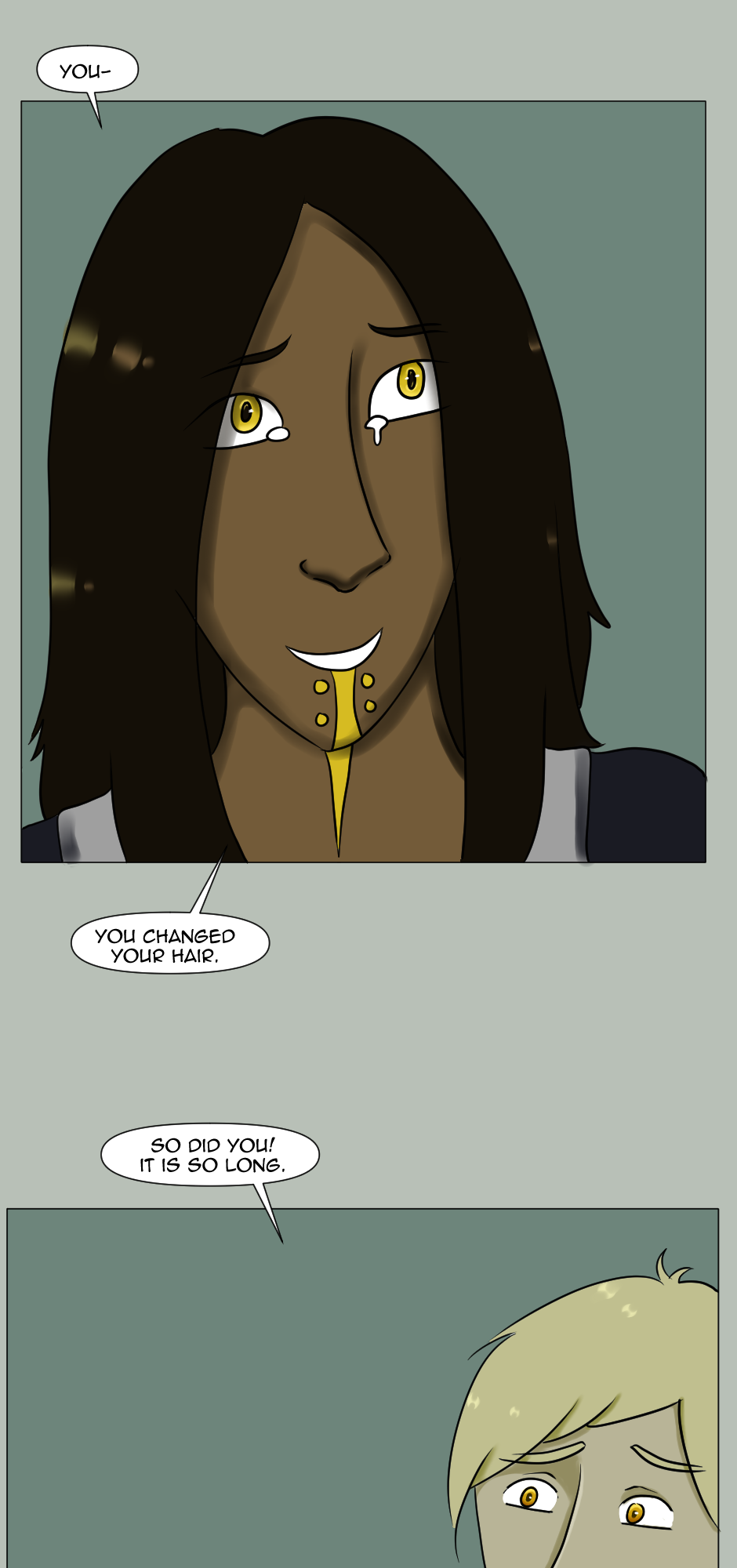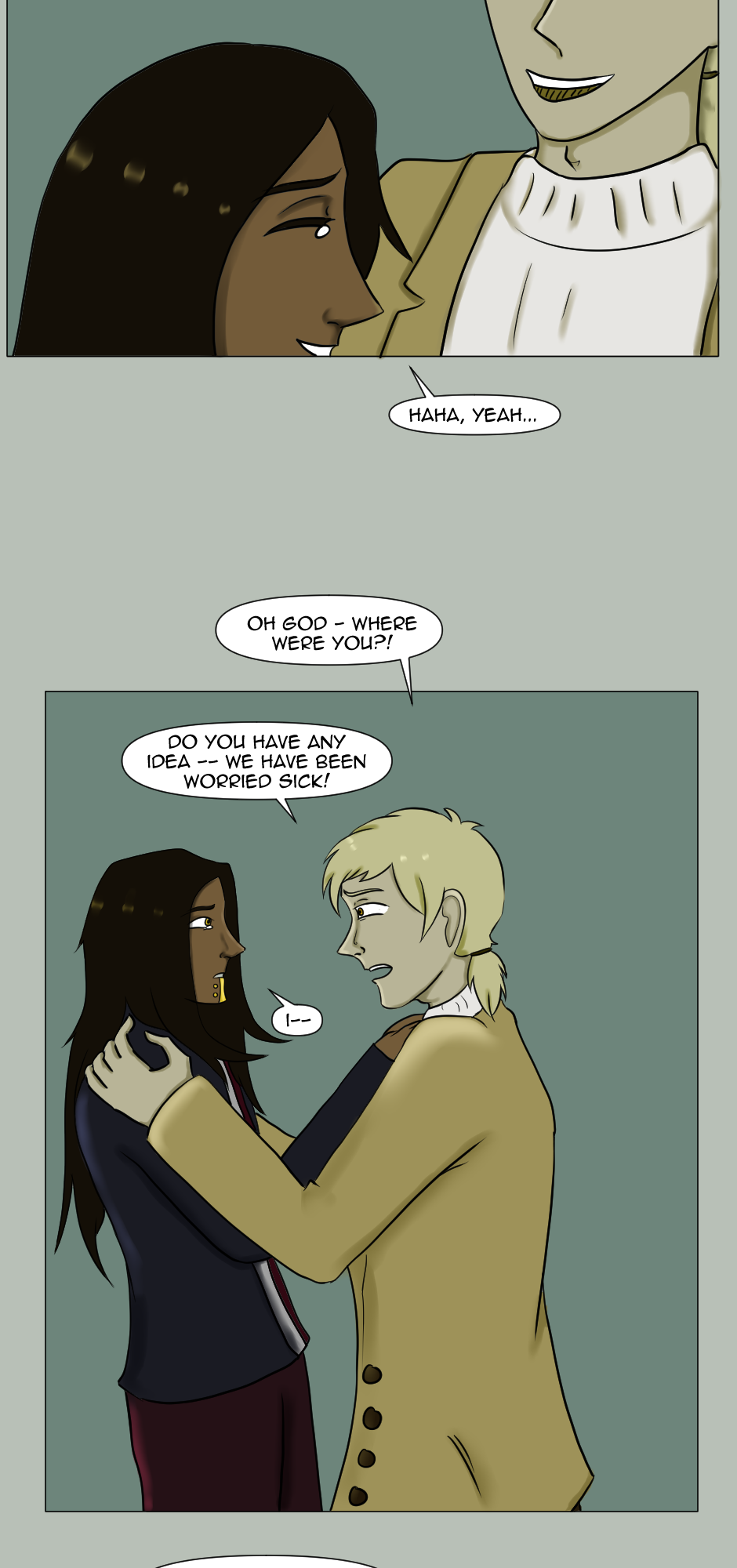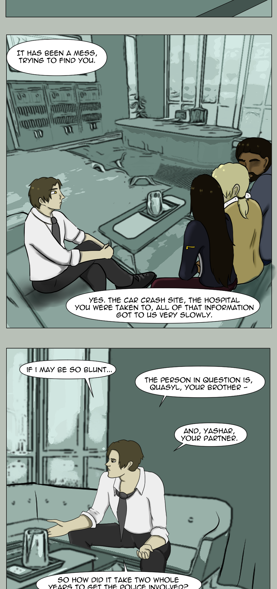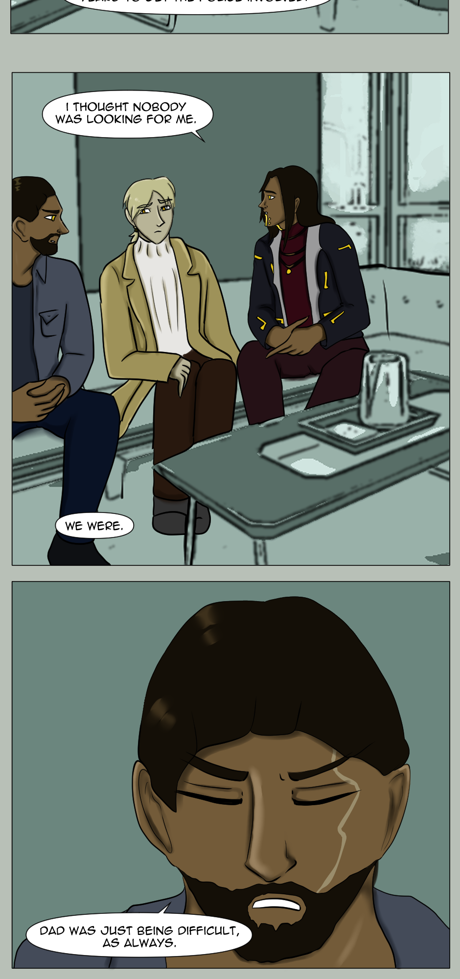 This page is one very exact descriptor of that, because I looked up SO many references for the sitting poses, and spent actually quite formidable amount of time on those alone. As the scene here is important, I felt that it was warranted to make it look cinematic, and by all aspects, a bit better than the pages I usually draw, to give it the look it deserves.