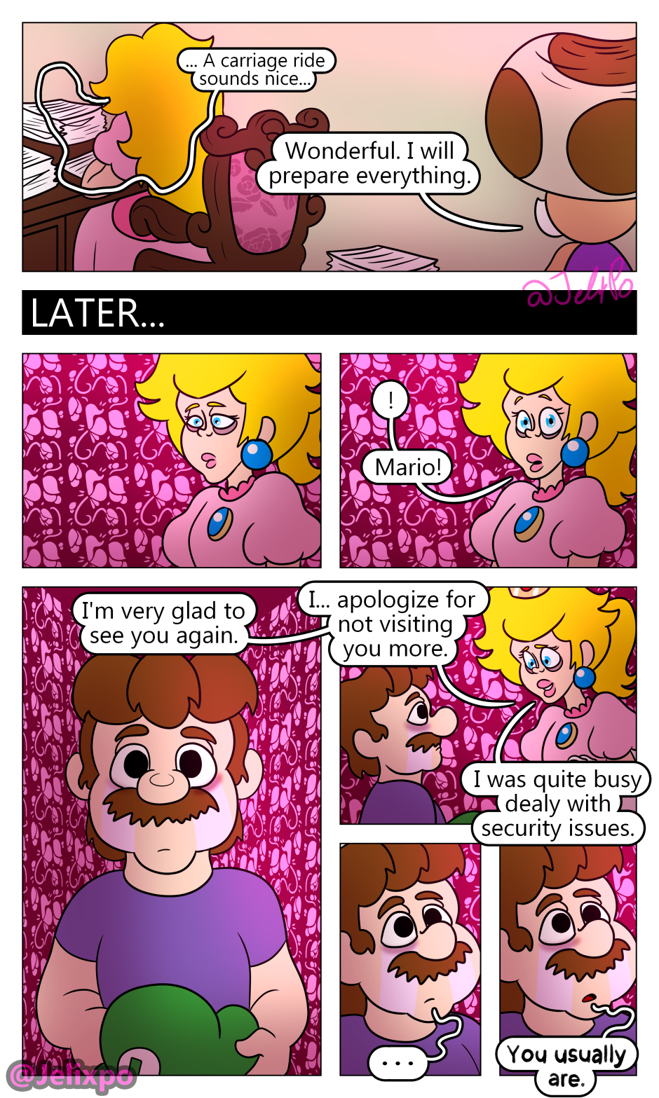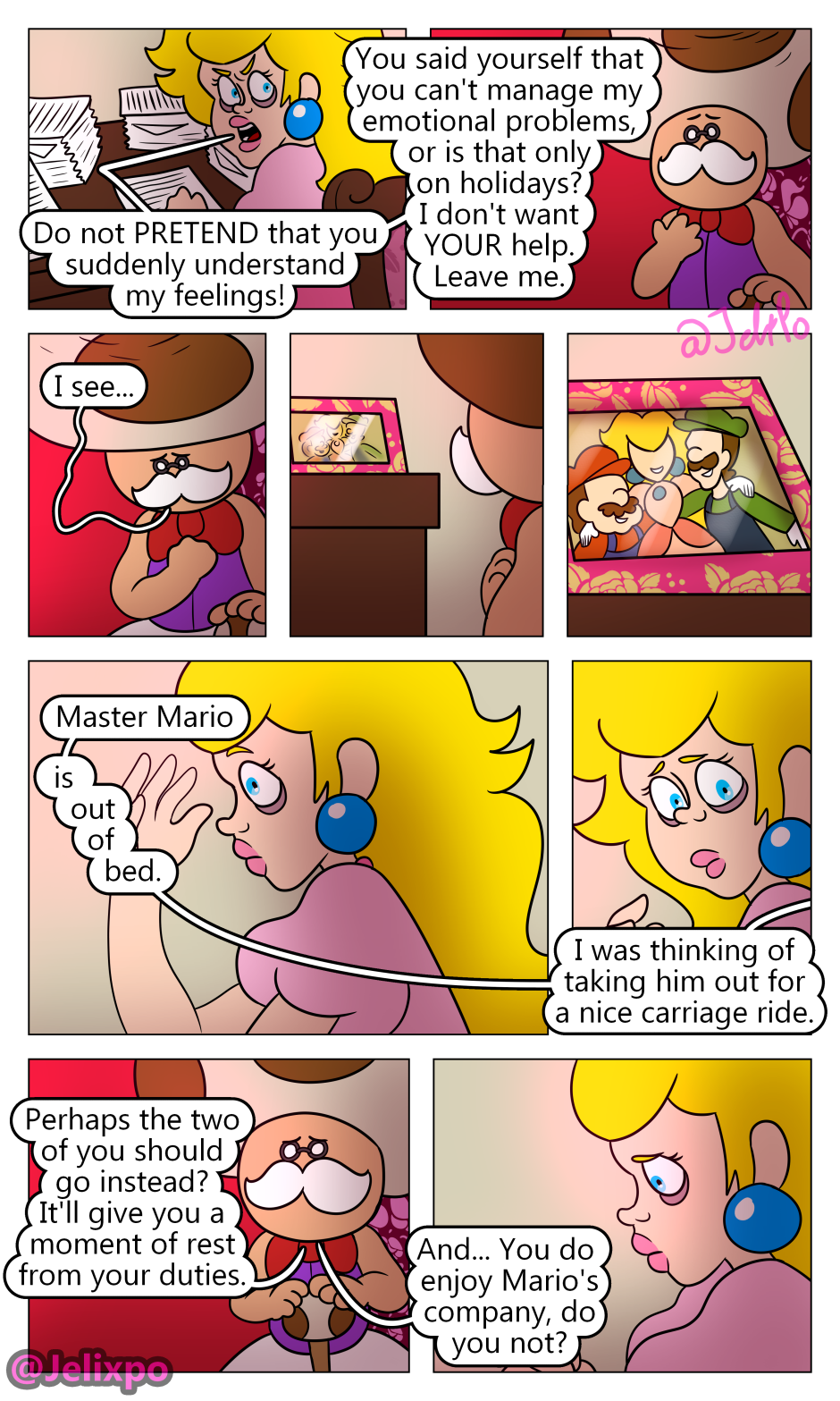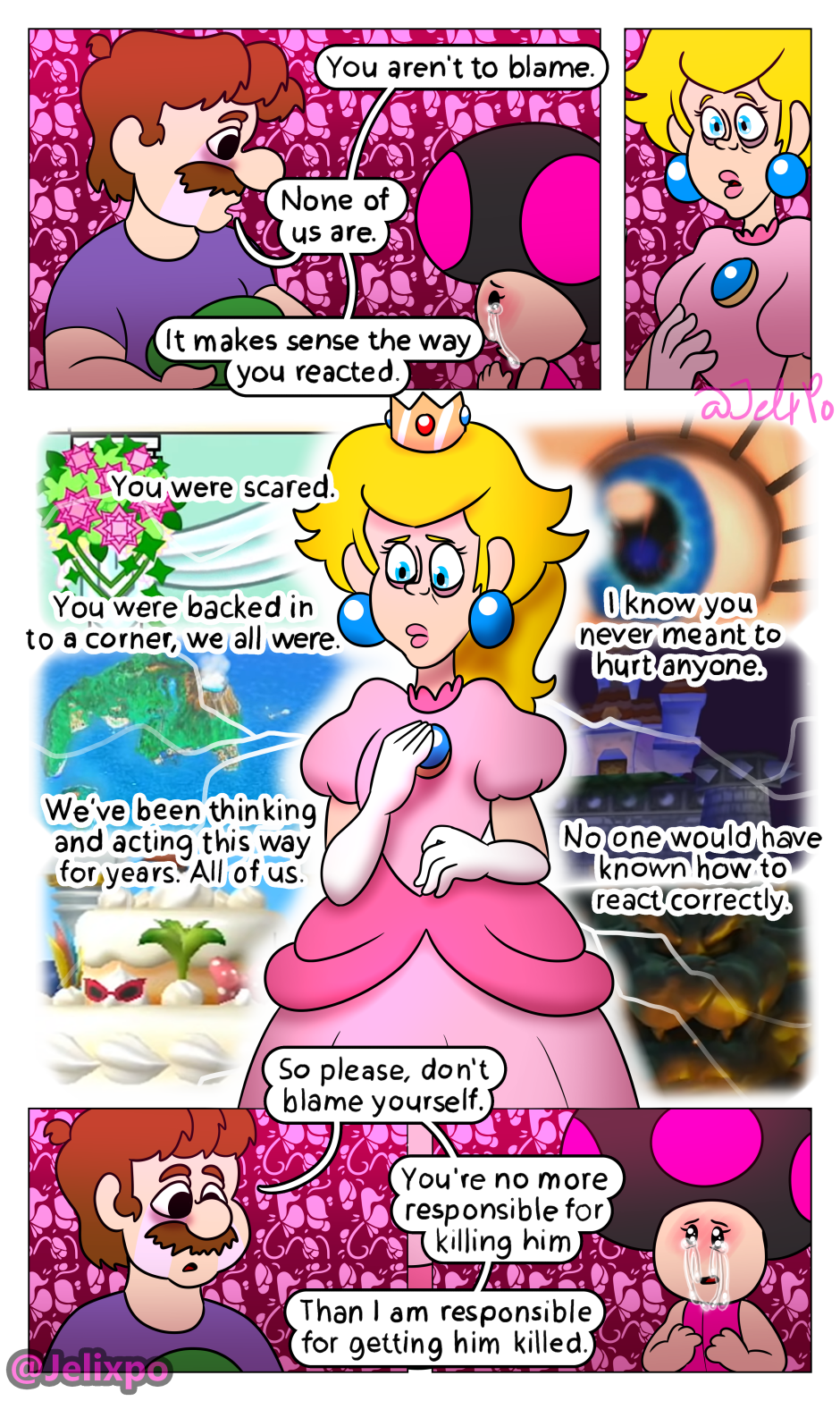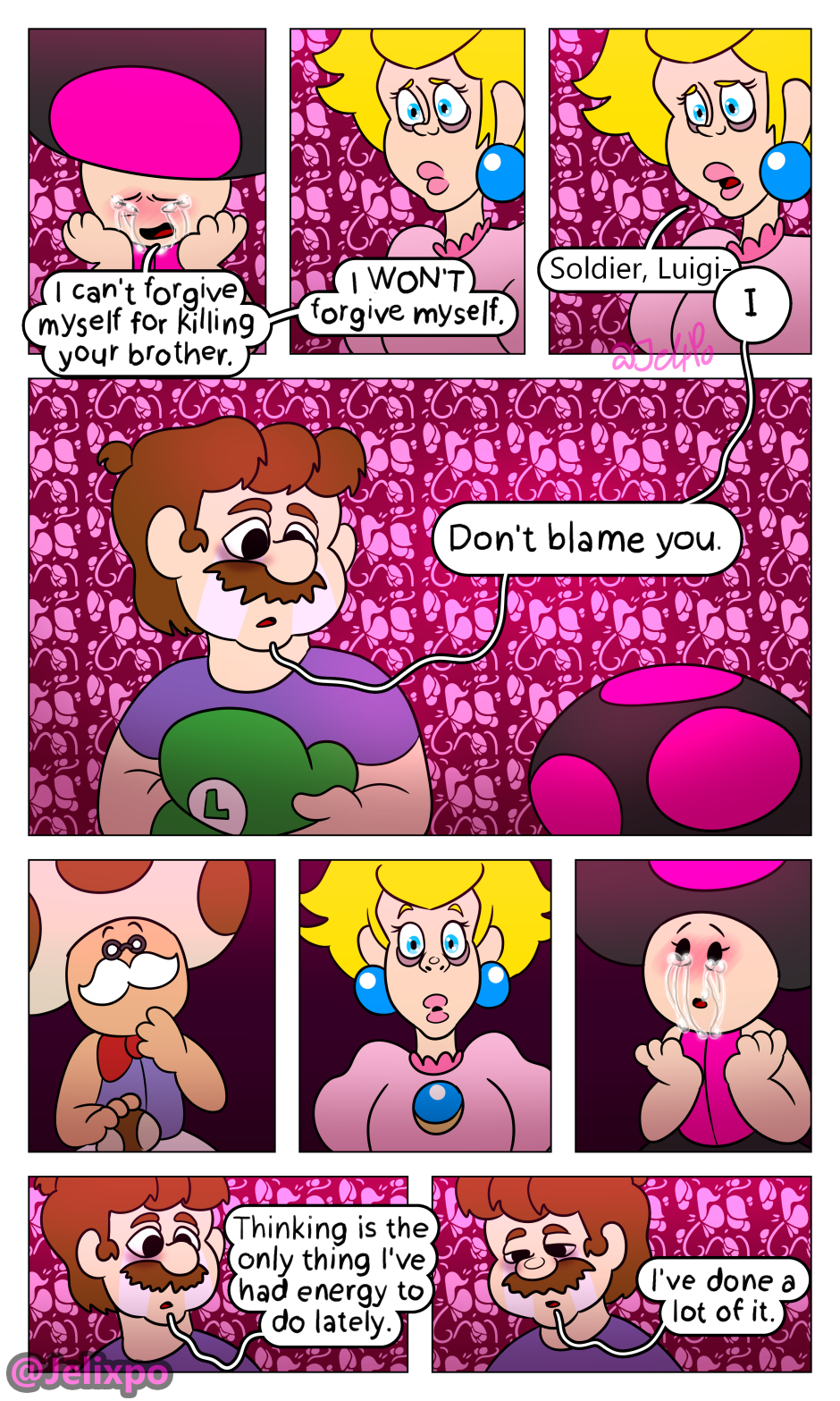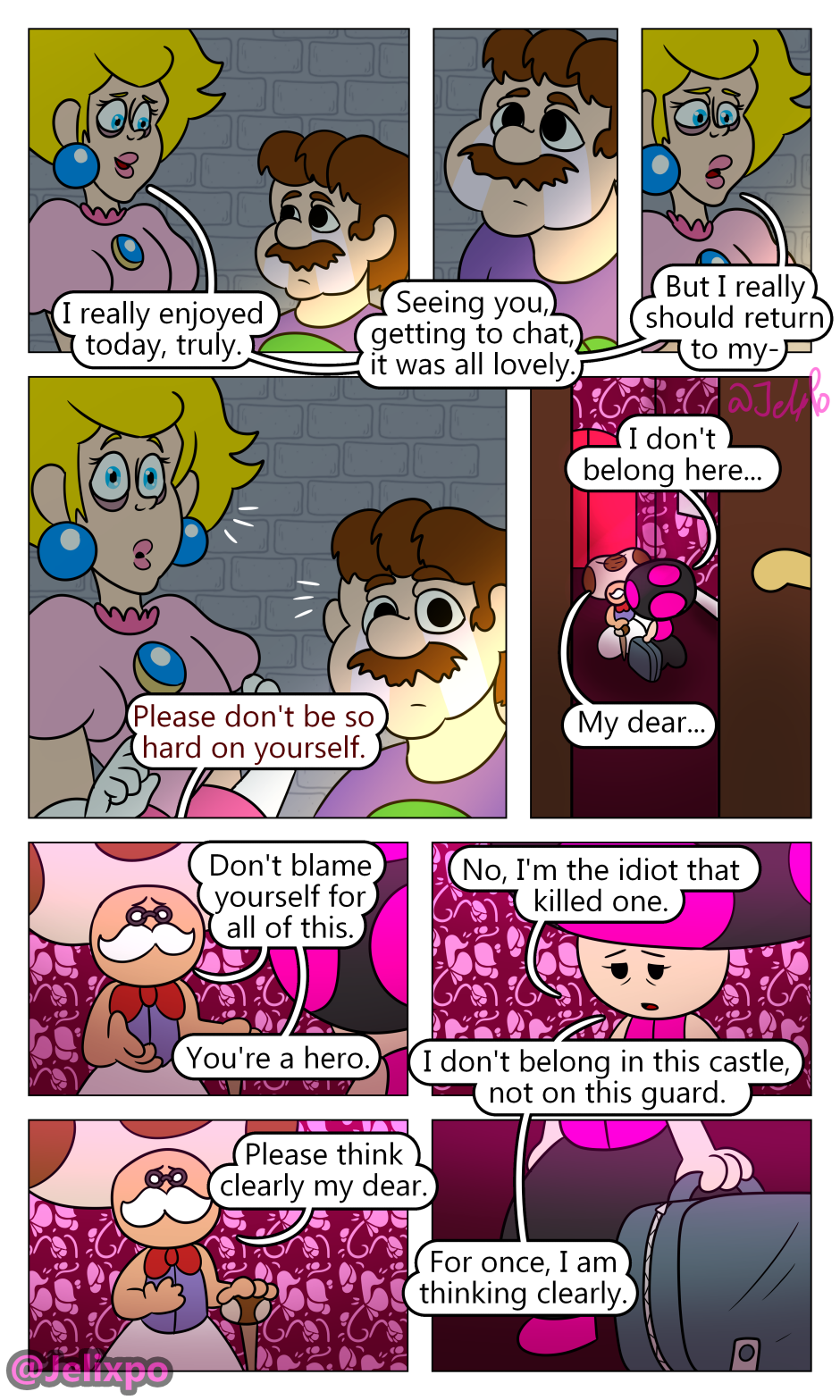 I’m happy both of them are really taking the time to realize the impact and importance Luigi’s death has had on them. Peach slowly realizing that she isn’t a innocent bystander in all of this and that she needs to change for the better, as well as Mario realizing that his actions towards both Luigi AND Bowser were not justified. At least, I hope he doesn’t completely blame Bowser.