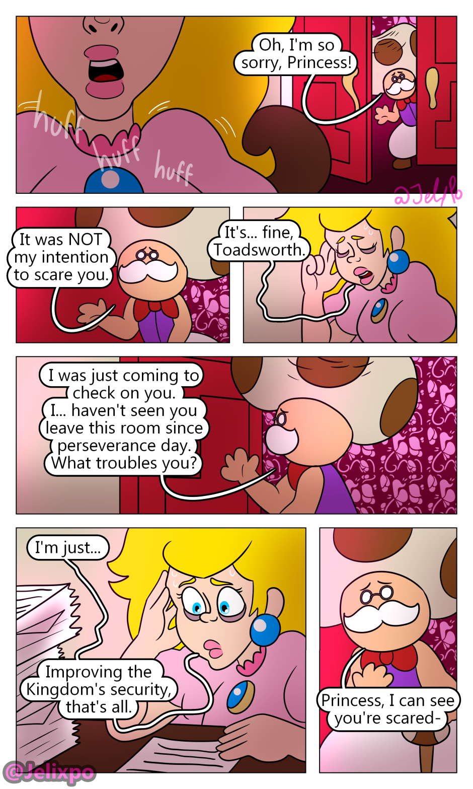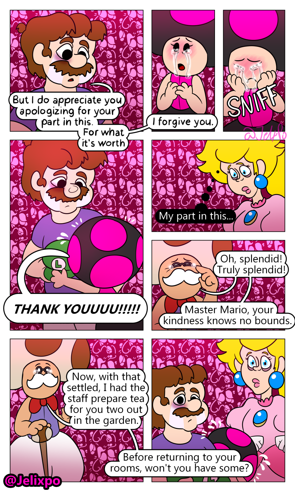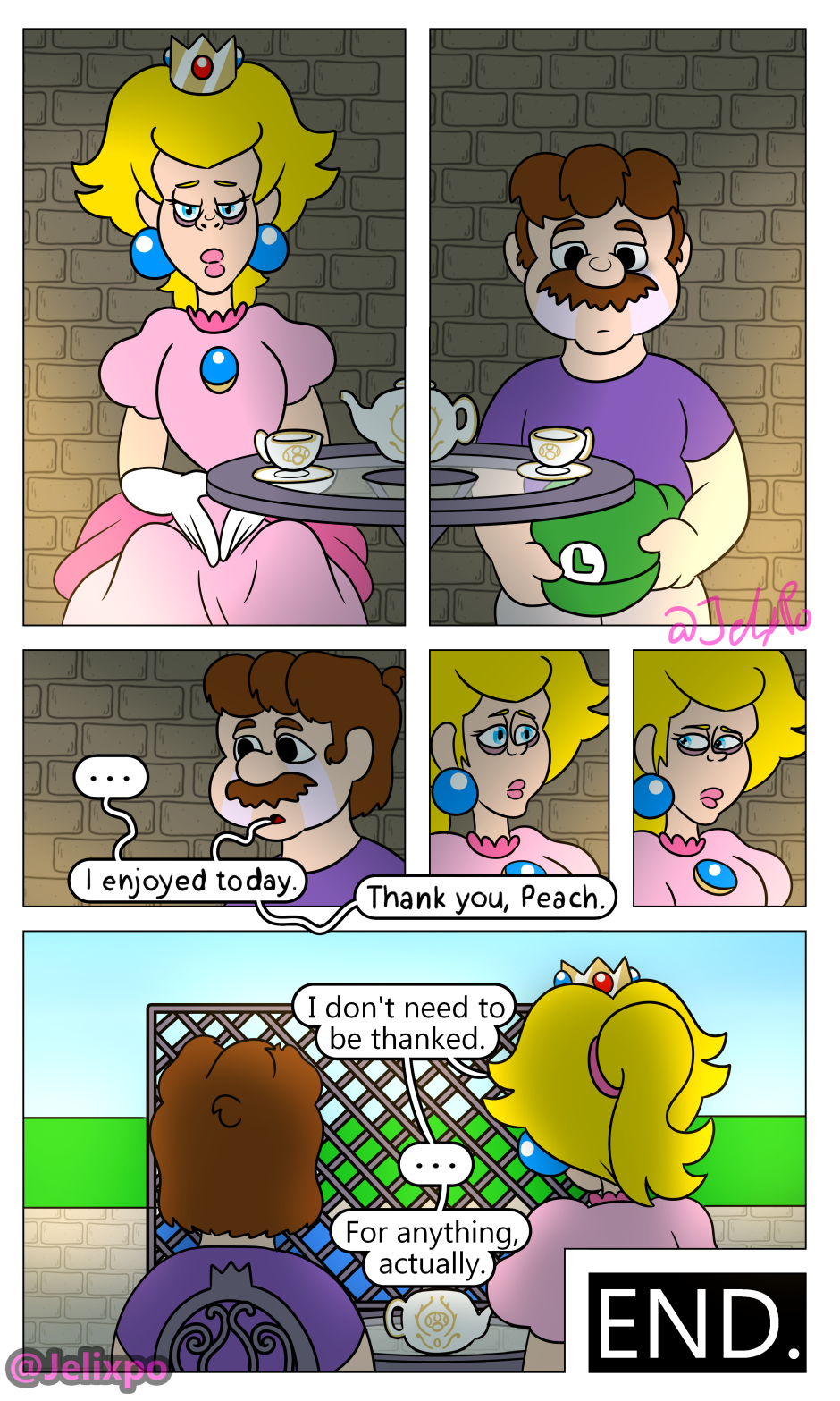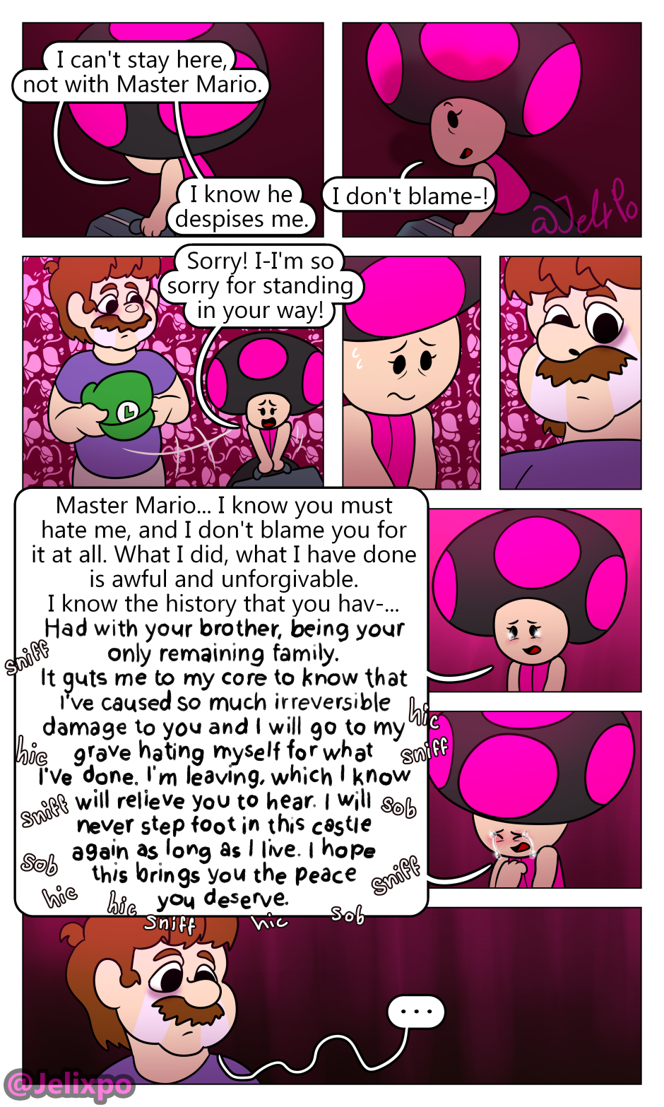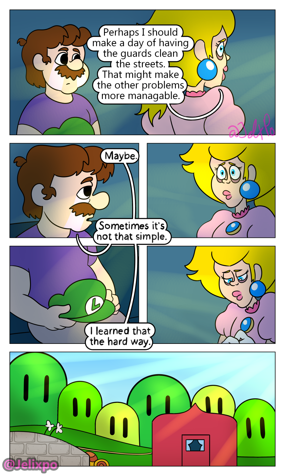 I’m happy both of them are really taking the time to realize the impact and importance Luigi’s death has had on them. Peach slowly realizing that she isn’t a innocent bystander in all of this and that she needs to change for the better, as well as Mario realizing that his actions towards both Luigi AND Bowser were not justified. At least, I hope he doesn’t completely blame Bowser.