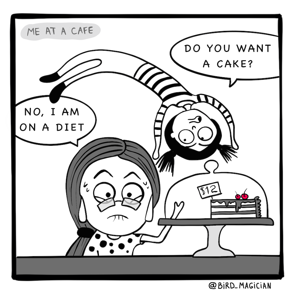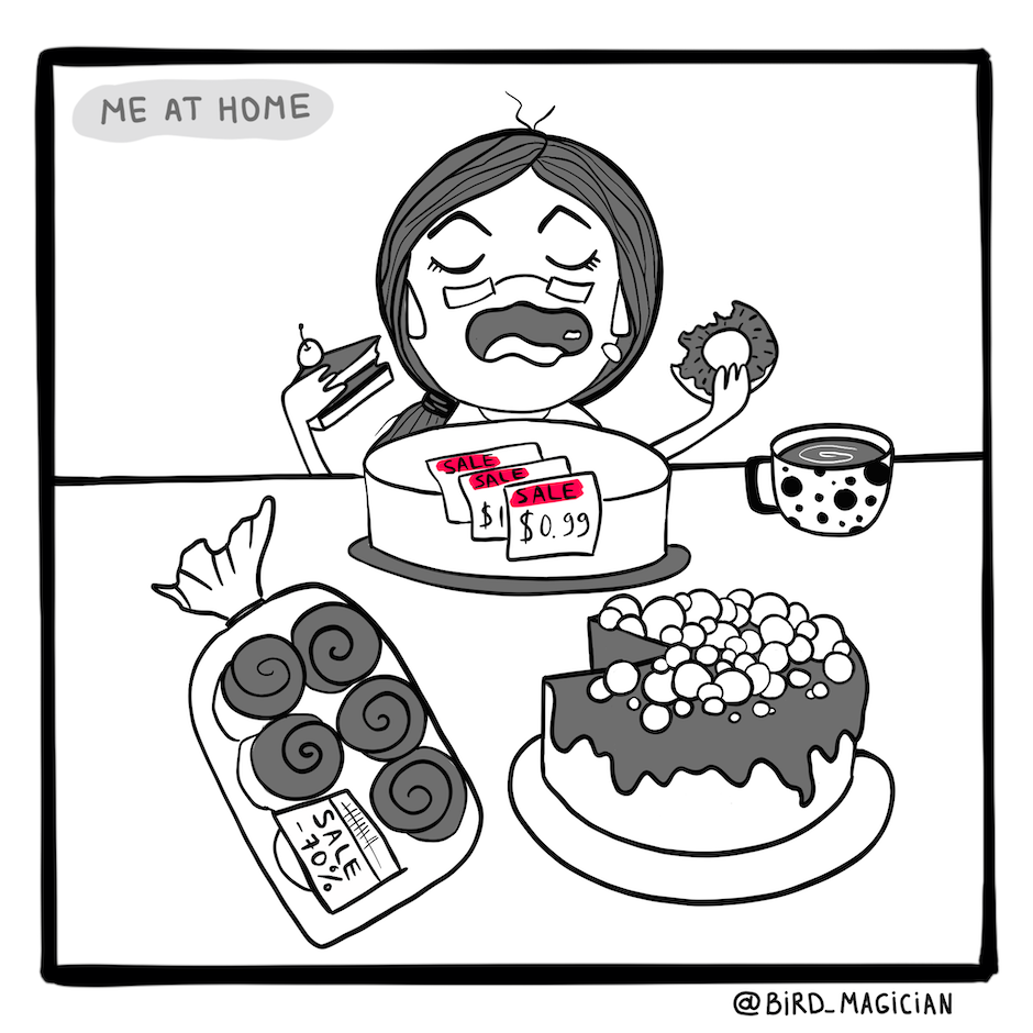 The price matters. When I see a piece of cake in a cafe at a high price I am straight away on a diet. But when I see a whole cake or buns at a great discount, nothing can stop me. Have you ever had a situation like this?