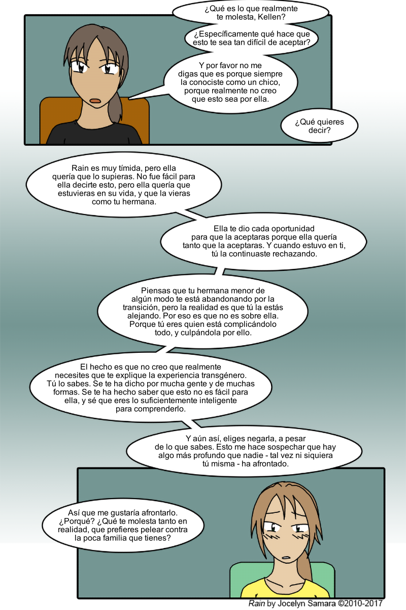 Y luego está Kellen. ¿Qué es lo que le pasa? Quiero aclarar que no creo que lo que hizo pueda simplemente ser razonado, y tampoco creo que encontrar la razón necesariamente la redima.Pero ella lucha tanto contra la gente que dice importarle, sabiendo que esto la aliena de los seres queridos que dice que no quiere perder, por algo que admite que no entiende por completo. Incluso ella tiene qué estar consciente a este punto que no hay ninguna realidad en que esto funcione de una manera que sea ideal para ella. Incluso en un mundo meramente hipotético donde Rain deje de transicionar y vuelva a vivir como chico (Nunca pasará, pero es hipotético), Kellen debe saber que Rain no le agradecerá o estará feliz con eso.