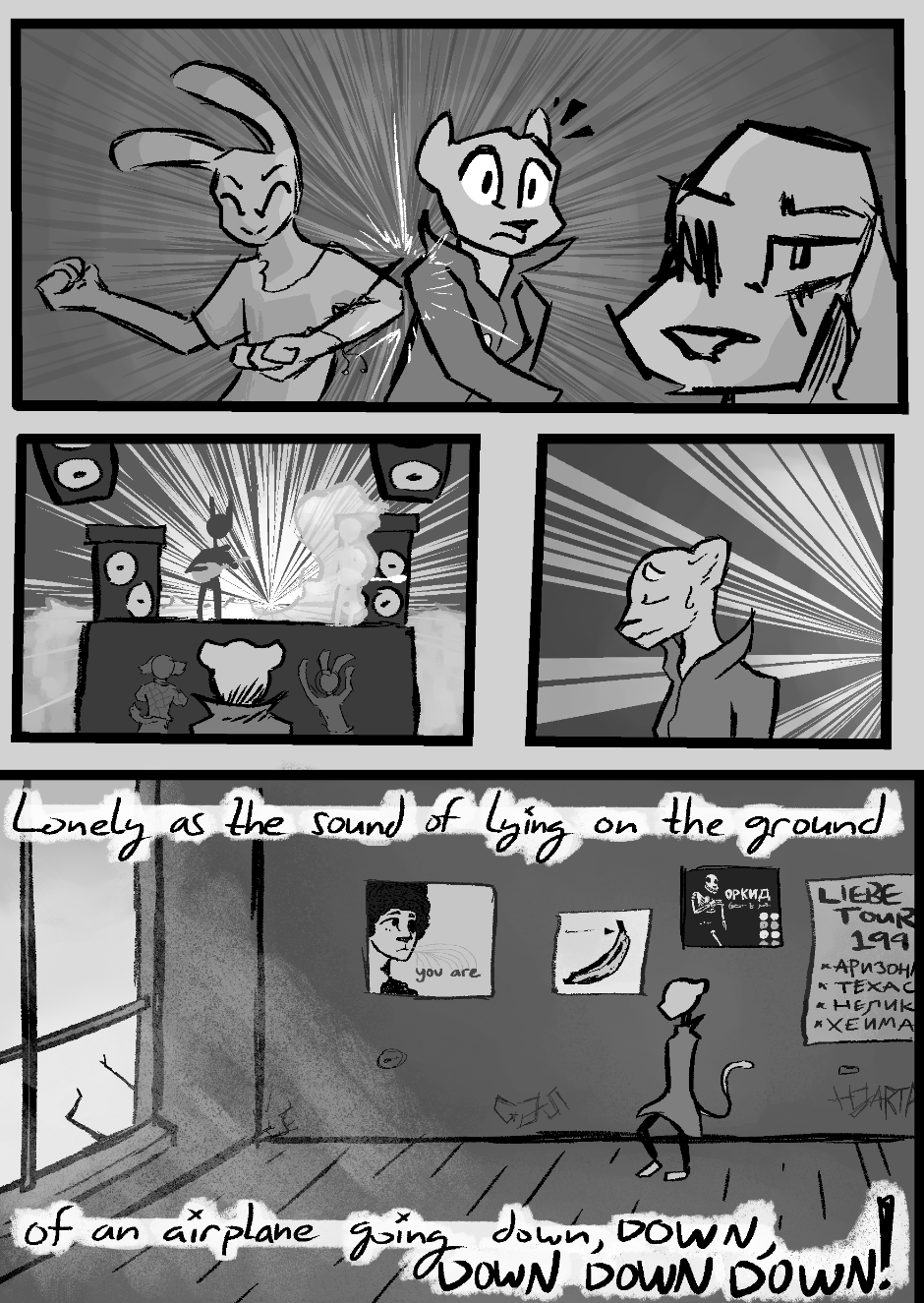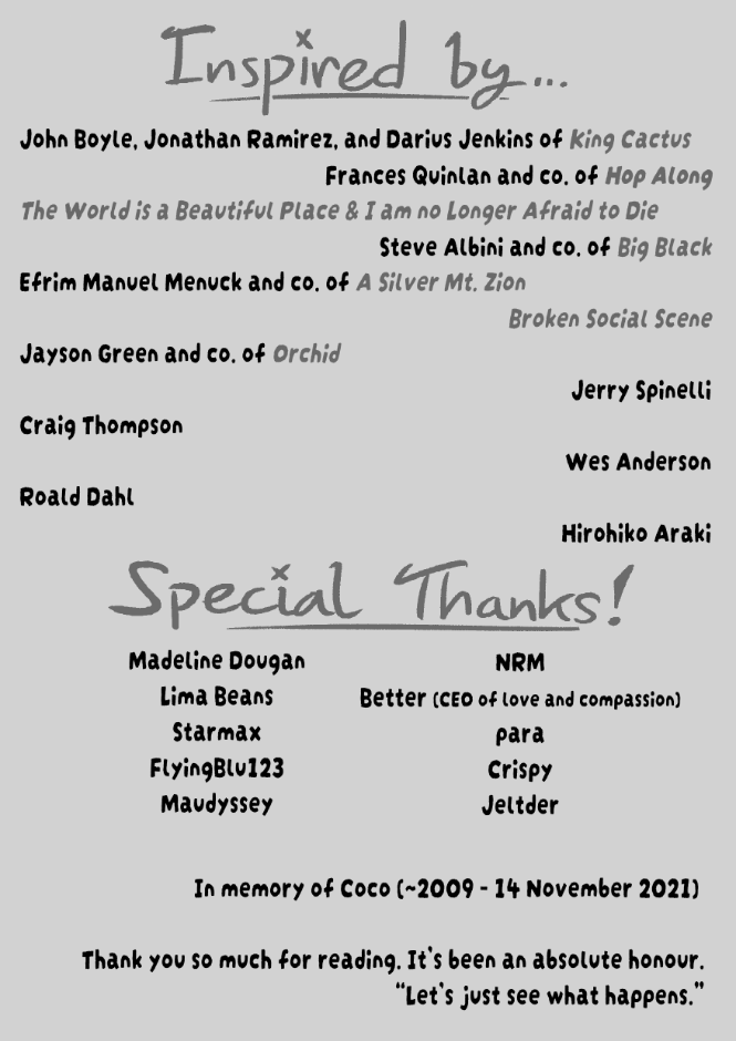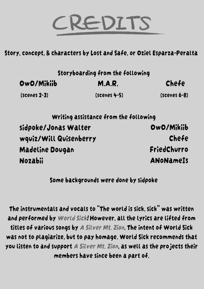 In the story, many character names, records, posters, etc. are allusions to bands and artists that exist in our world. These allusions are in no way meant to detract or plagiarize from their work in any way; the intent is to pay homage to these acts that have been greatly inspiring. At the end of the credits are listed all of the groups that are significantly alluded to. I highly encourage the reader to check out their work, if they are so inclined.