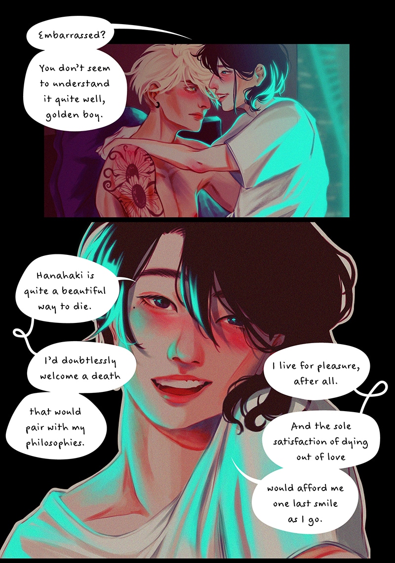 Pillow Talks is a tragedy told from bedsheets that explores the life and relationships of characters who suffer from hyperanthropia – an illness that befalls those who become “more human than everyone else”, shaping their most critical flaws into beautiful, yet rather unnatural symptoms. The narrative delves into symbolism and the concepts of ephemerality and death, intimacy and love, revealing the secrets and vulnerabilities of Dazai – a hedonist man incapable of telling the truth, whose lungs are filled with flowers – and Nico – a passionate man incapable of restraining his anger, whose skin drips molten gold.