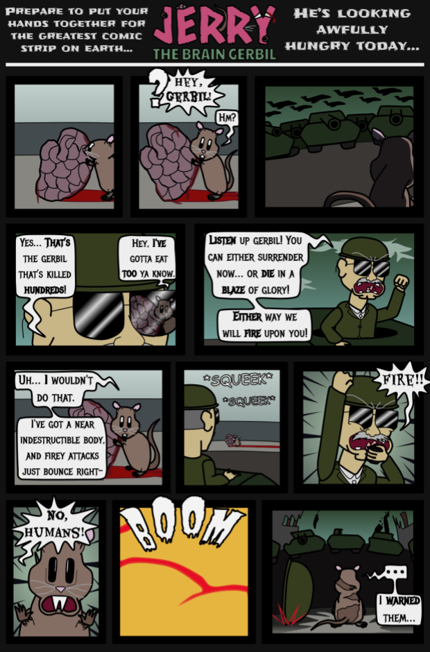 END STRIP: Immortal brain gerbil Jerry is an escaped lab experiment wandering the sands of the Sahara desert; looking for the brains of idiots to either feed on, or make smart again.