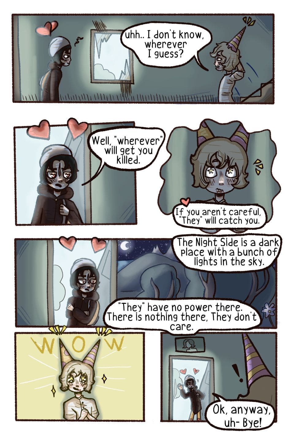 It's the year 2107. The Earth isn't spinning anymore. There is no more day/night cycle. All of the remaining Earth's population lives on the Day Side. The people in power are referred to as "They", and the people below them don't have the freedom of thinking and deciding for themselves anymore. Eric and Dan are different, though. On their journey to the Night Side, the place of freedom, they will meet someone with a secret.