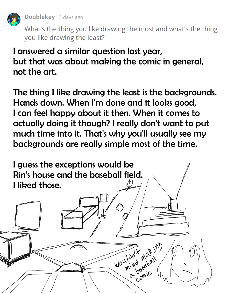 Yo, is that me right there? Ok, jokes aside, I know I'm a month late, but still. Backgrounds are a true pain for me too and I always have a hard time drawing them. The worst part is backgrounds+ perspective and having to do lineart for the backgrounds. Also, anime OSTs are always a huuuge source of inspiration.