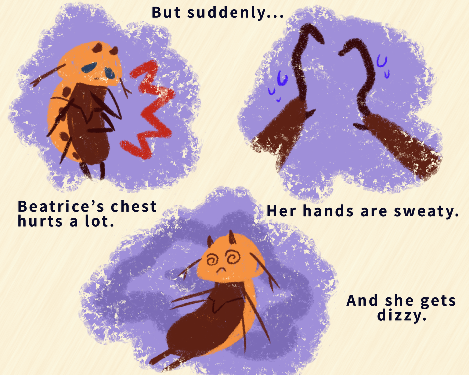 Page 7 Description: Above left, Beatrice stands in a droopy manner with two claws on her chest. Above right, a close up of her claws with sweat indicators around them. Below, Beatrice stands at a slant with spiral eyes. Each area is on top of a blue blotch, they are below has alternating shades of light blue and a darker blue in a wonky circle originating at Beatrice's head. Text: But suddenly... Beatrice's chest hurts a lot. Her hands are sweaty. And she gets dizzy.