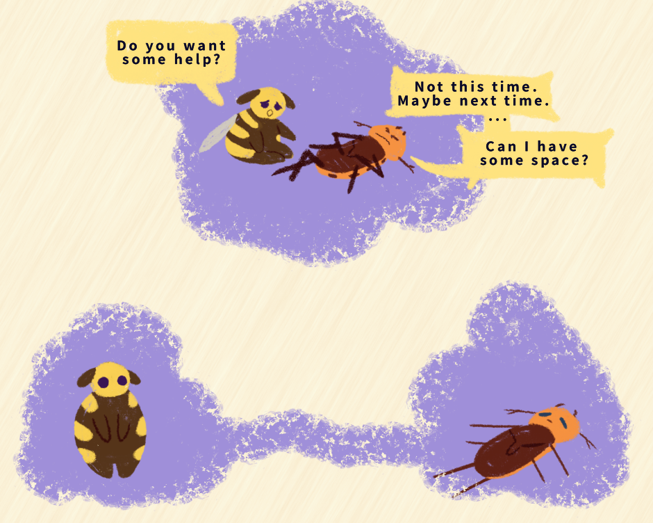 Page 9 Description: Above, Beatrice lies on the ground, claws clutching her lower torso, her eyes are closed. Barry sits next to her, their wings and antenna droops. They are in front of a blue splotch. Below left, Barry stands alone, antenna drooping with hands nearly together. Below right, Beatrice lays on the ground alone, with her eyes slightly open. Both below areas have a blue blotch behind the characters, a line of the same color and texture extends from each to connect the two blotches.