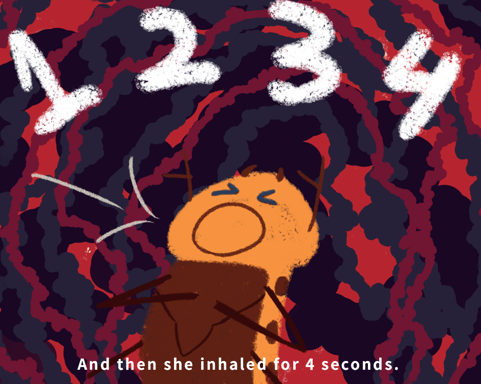 An old creative writing assignment for High School. Intended to teach children about the 4-7-8 breathing technique that they can apply to many areas where they may need to cope, however the comic focuses on an unlabeled panic attack. If you intend for your children to read, I would suggest you read it first.