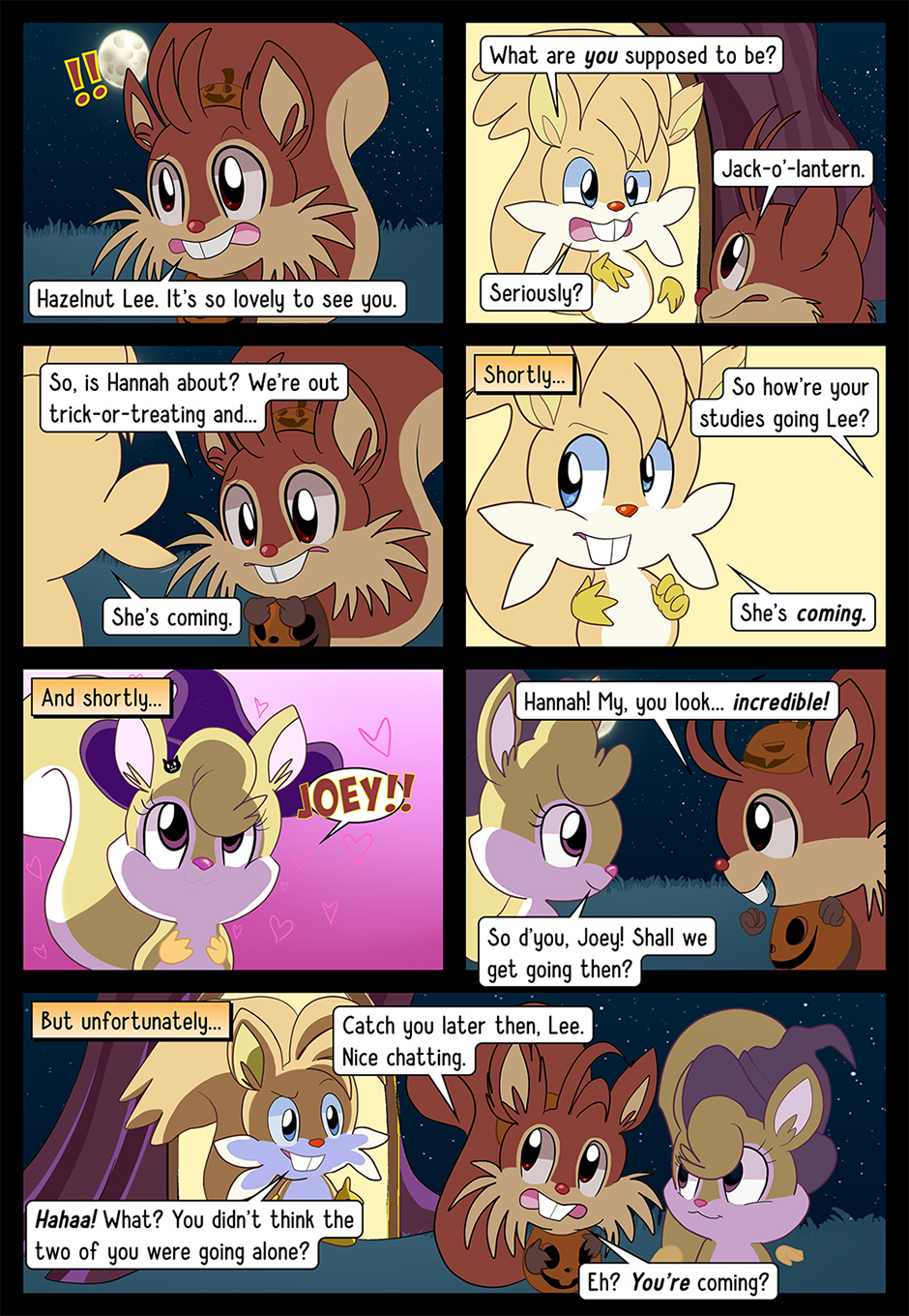 Welcome to Acorn Joey: Trick-or-Treat. The tale is that of a bright, young spark of a squirrel named Acorn Joey—oh so deathly afraid of Hallowe'en, whilst so keen to prove himself his lady love. Will he face up to his fears? Will he overcome his nightmares? Or will he cry again, like last year? There is but one way to find out…