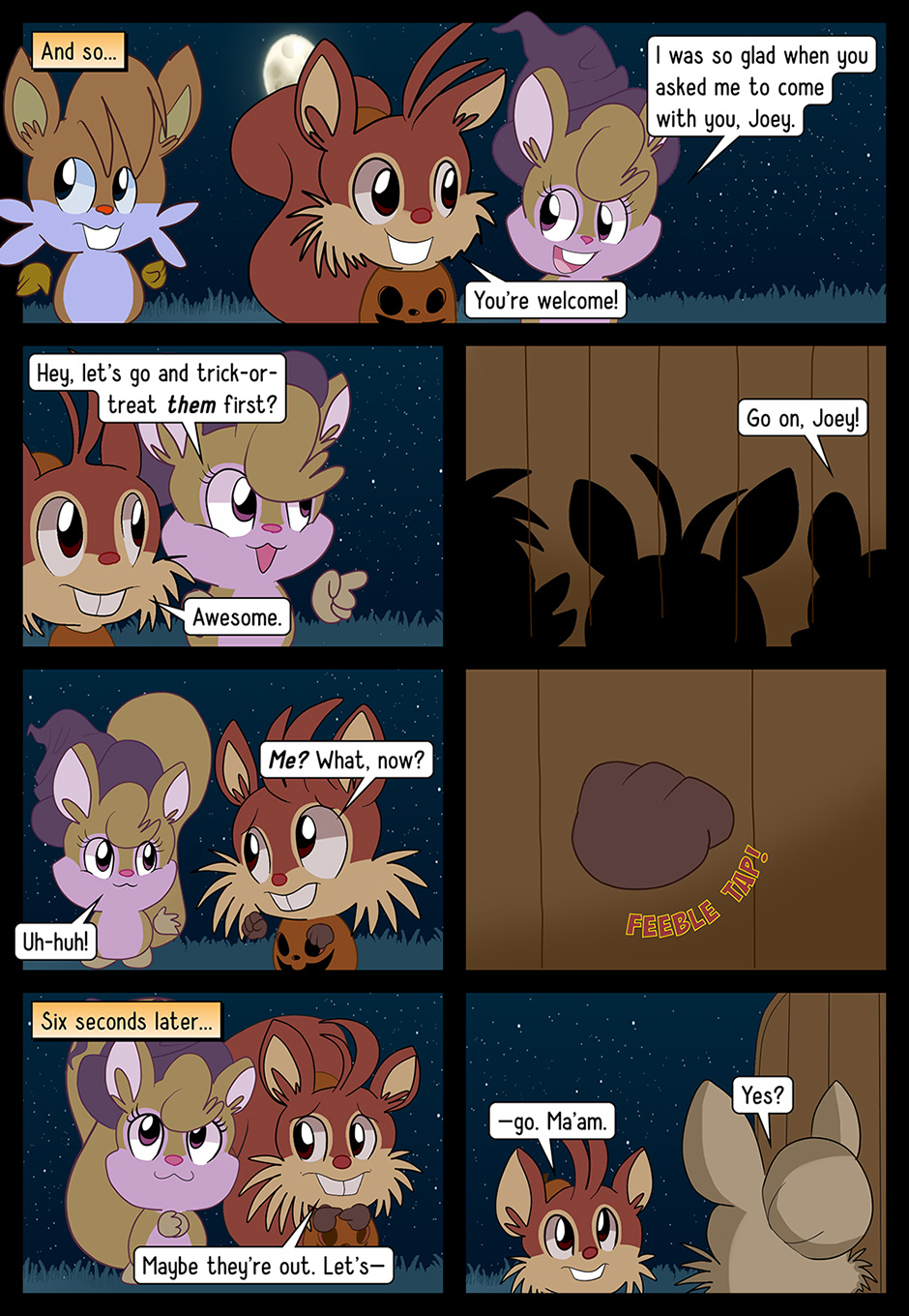 Welcome to Acorn Joey: Trick-or-Treat. The tale is that of a bright, young spark of a squirrel named Acorn Joey—oh so deathly afraid of Hallowe'en, whilst so keen to prove himself his lady love. Will he face up to his fears? Will he overcome his nightmares? Or will he cry again, like last year? There is but one way to find out…