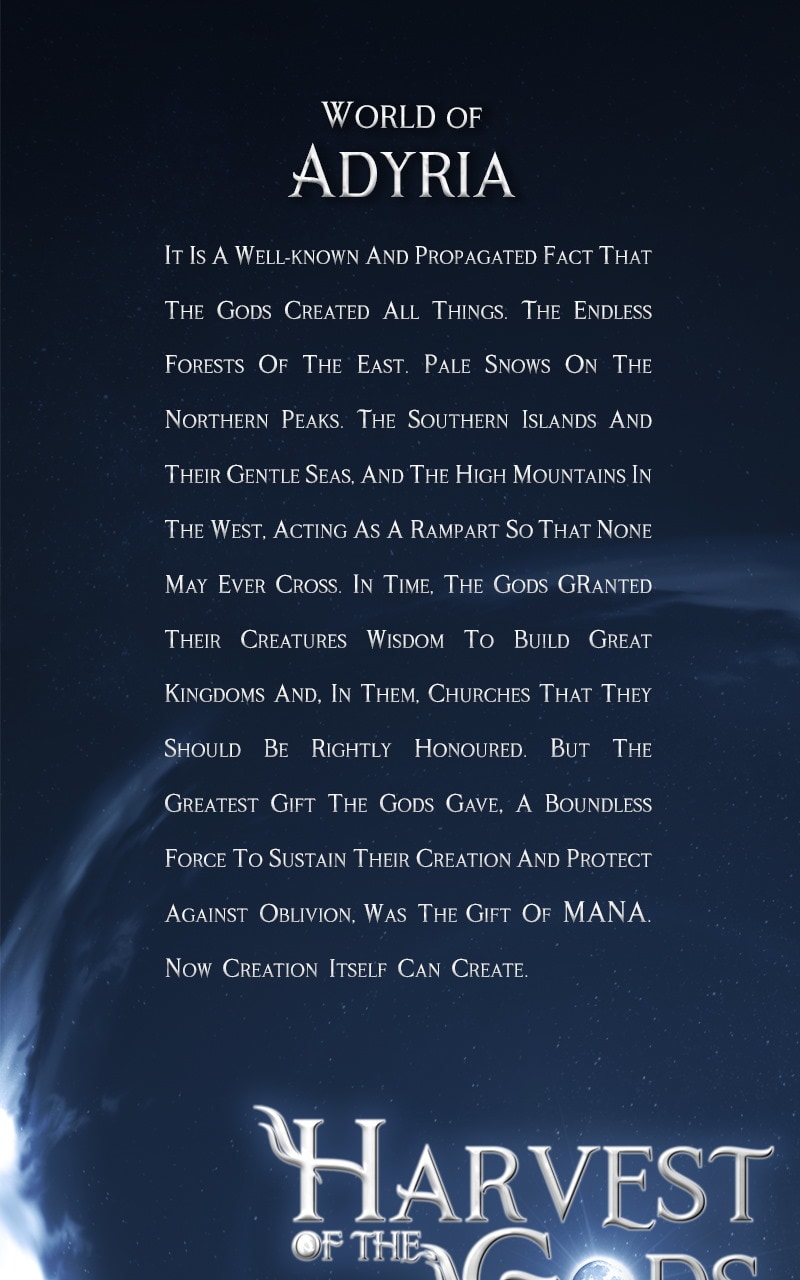 Harvest of the Gods is an epic fantasy adventure series. In a world of swords and spells controlled by a tyrannical theocracy, the series follows a family of outlaws operating from a cottage hidden deep within an impassable forest. Over the course of the initial arc, the team travels the land getting involved in dangerous missions, while often confronting names and events from their pre-outlaw past.