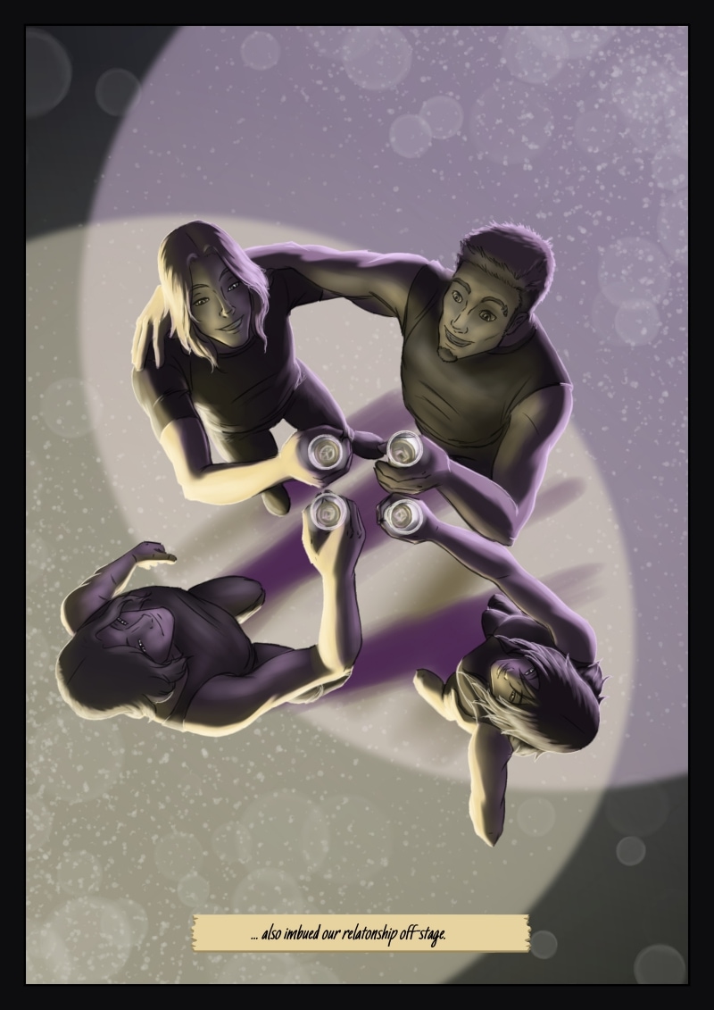 About the drawing, I tried to mantain the style from the last page. I think it's less powerful, but that's okay. They're just relaxing and enjoying after the gig now ^^