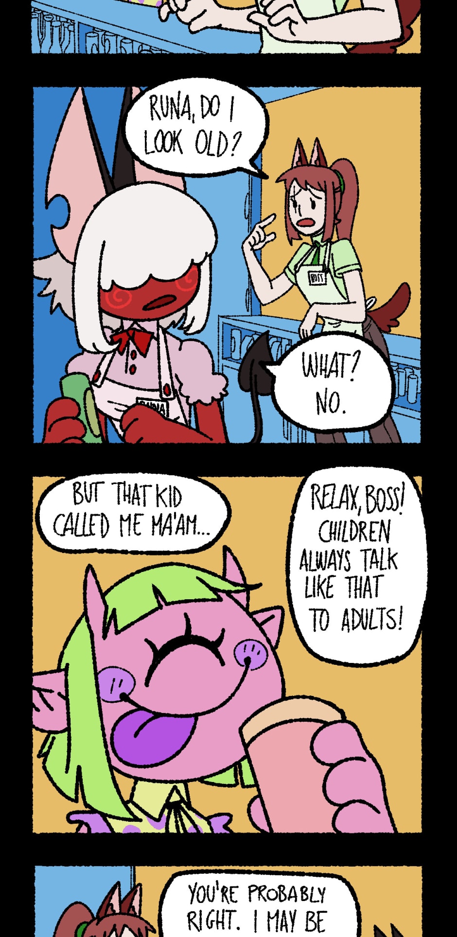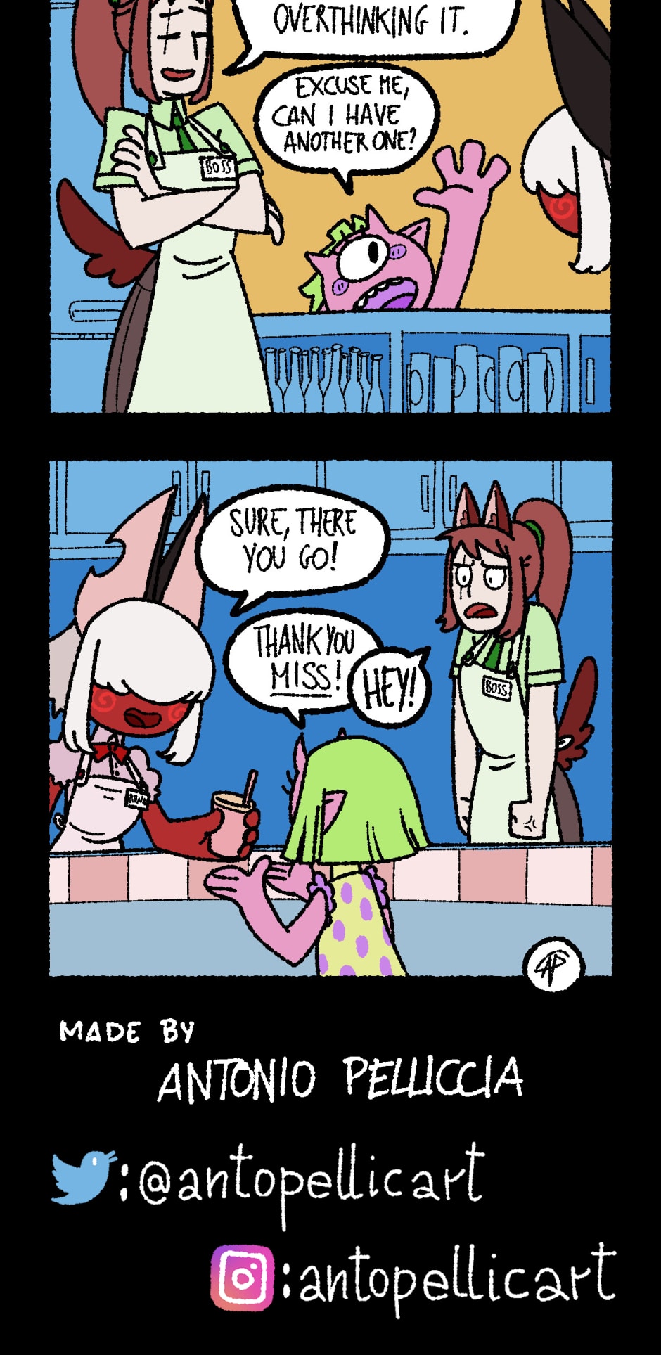 What if a zombie wants a good burger instead of the usual brains? Are vampires tired of drinking blood, and could use a nice coffee after an all nighter? Do eldritch horrors from out of reality want fries with their chicken nuggets? Go to the Monster Diner and find out! The Boss, Runa and Ed are sure to satisfy every costumers... or make a mess trying.
