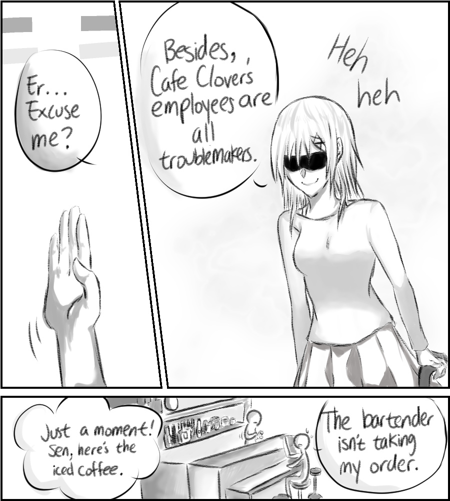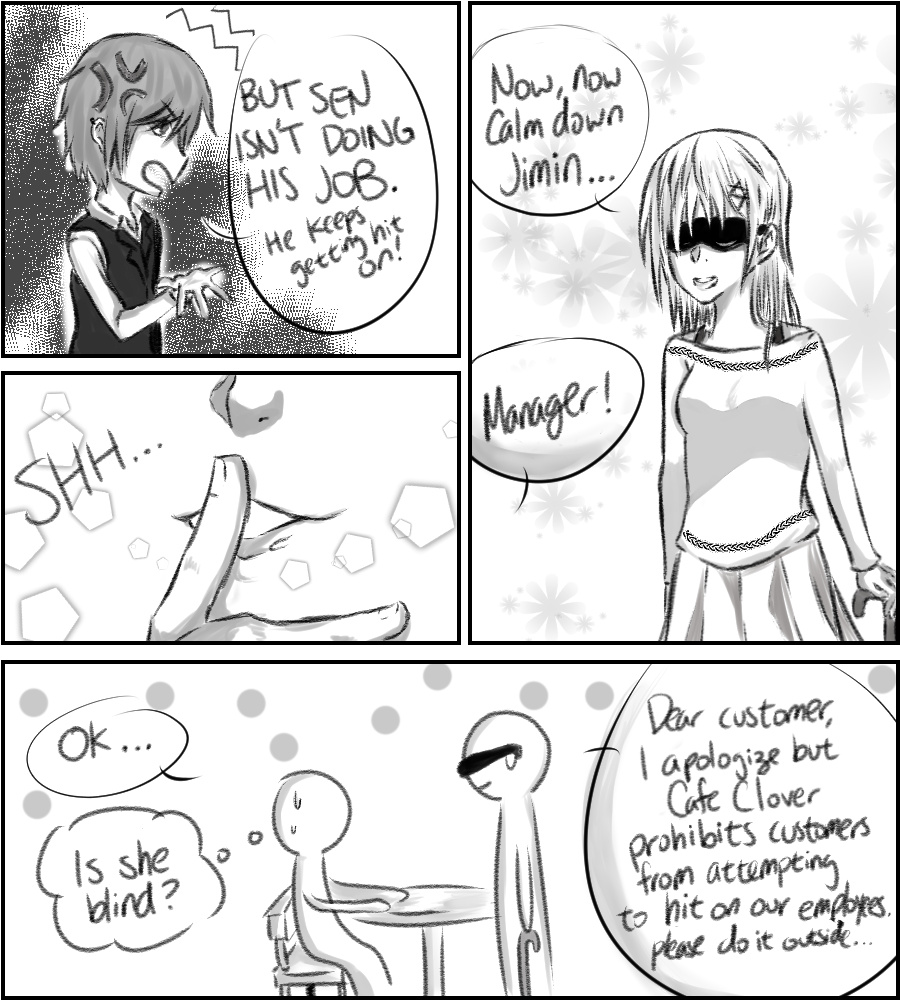 Introducing Sen's co-workers! Jimin doesn't hate Sen (he actually respects him). The manager is blind, but her special sunglasses allows her to see.