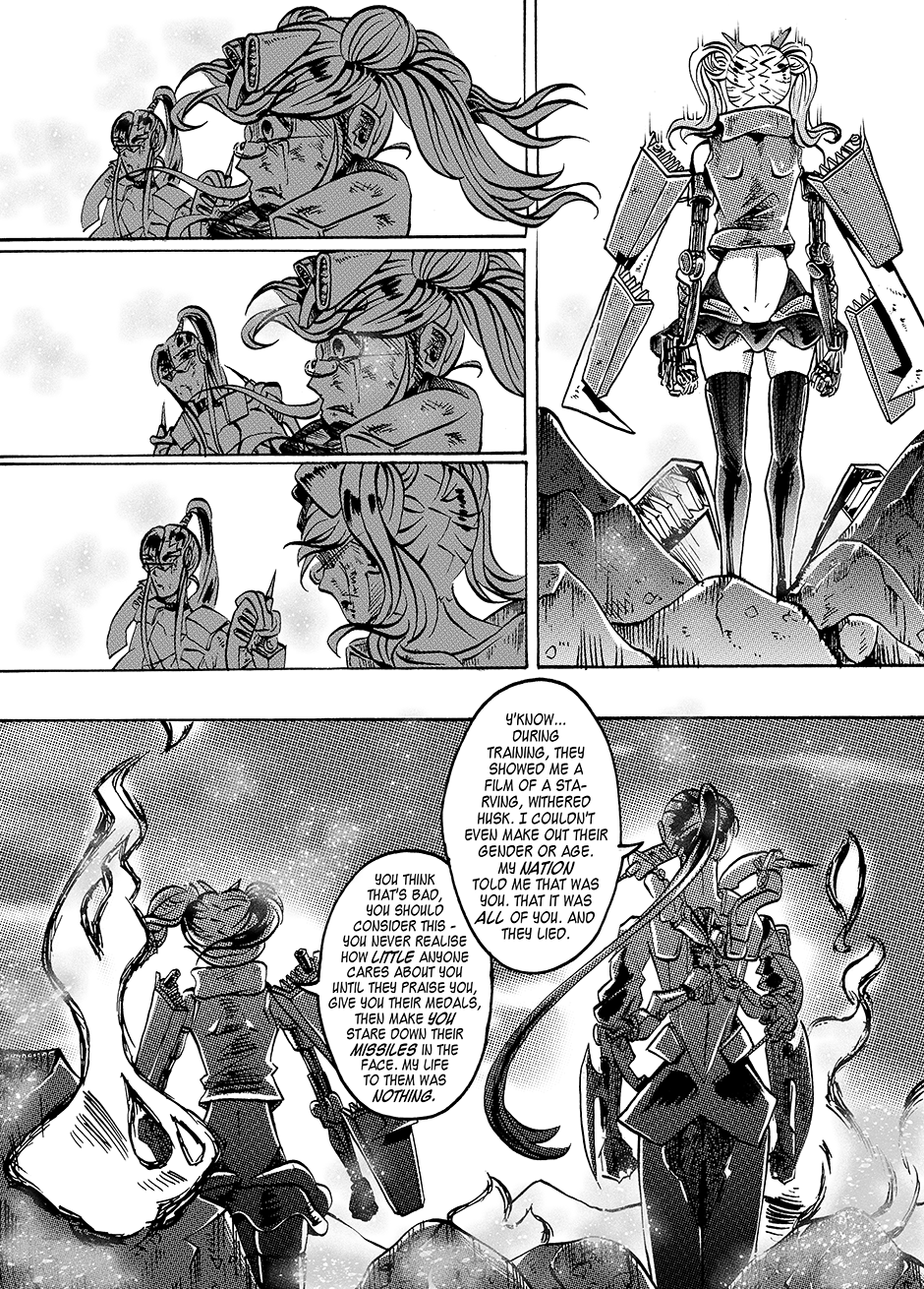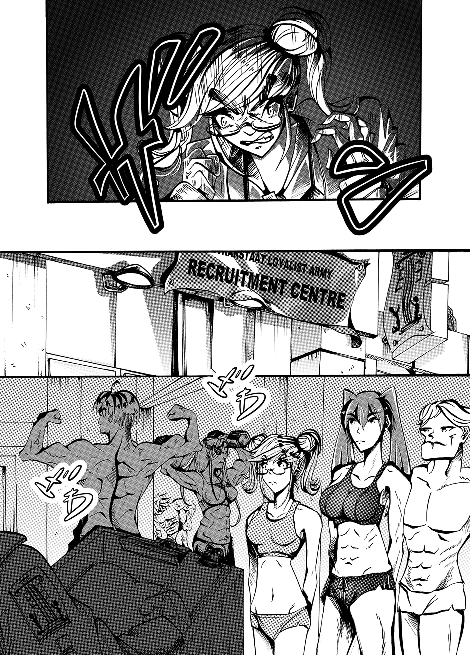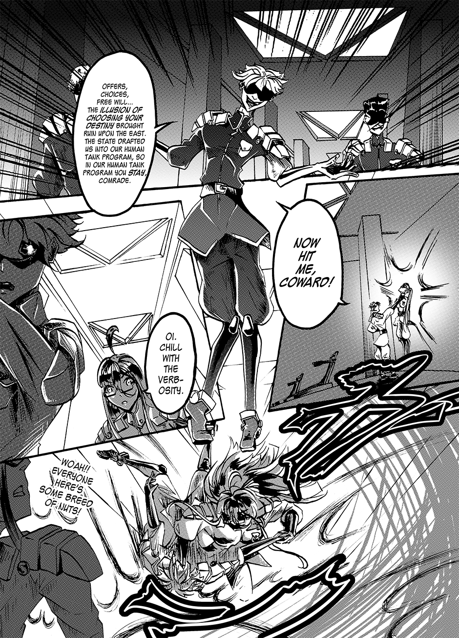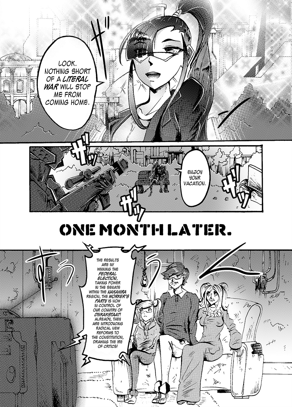 Lovers Lina Schneider and Rika Watanabe find themselves separated on opposite sides of the border as their country splits in two. Upon learning that Rika might be suffering from a tyrannical government on the other side of the country, Lina enlists in the military in a bid to free her. Rejecting her humanity to become a living weapon with enough firepower to level a city, she soon finds out she's not the only one of her kind... [Updates every other day]